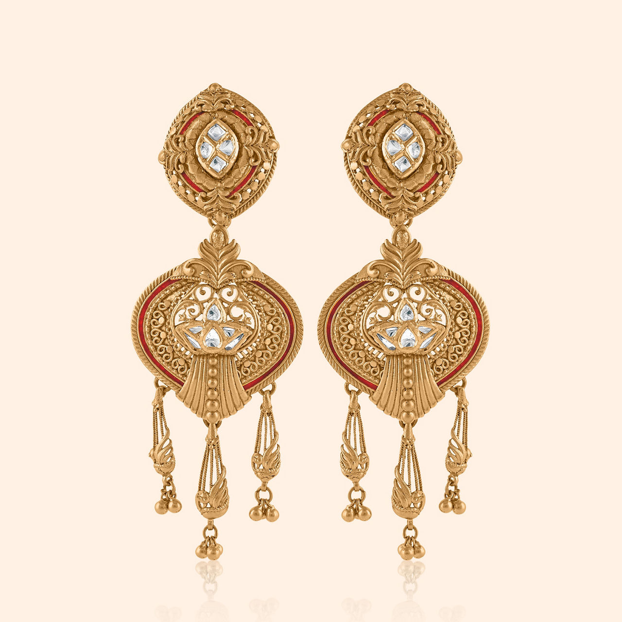 A bride's true aura, etched in gilded grace, where ancient art meets modern space. This exquisite 22KT yellow gold bridal choker necklace, imbued with an antique finish, tells a tale of elevated tradition. Its intricate floral and harmonious motifs are adorned with shimmering gemstones, culminating in a captivating detachable pendant. Designed to grace your most significant day, it is the perfect complement to a majestic lehenga or a heavy silk saree, celebrating the grandeur of your bridal journey.