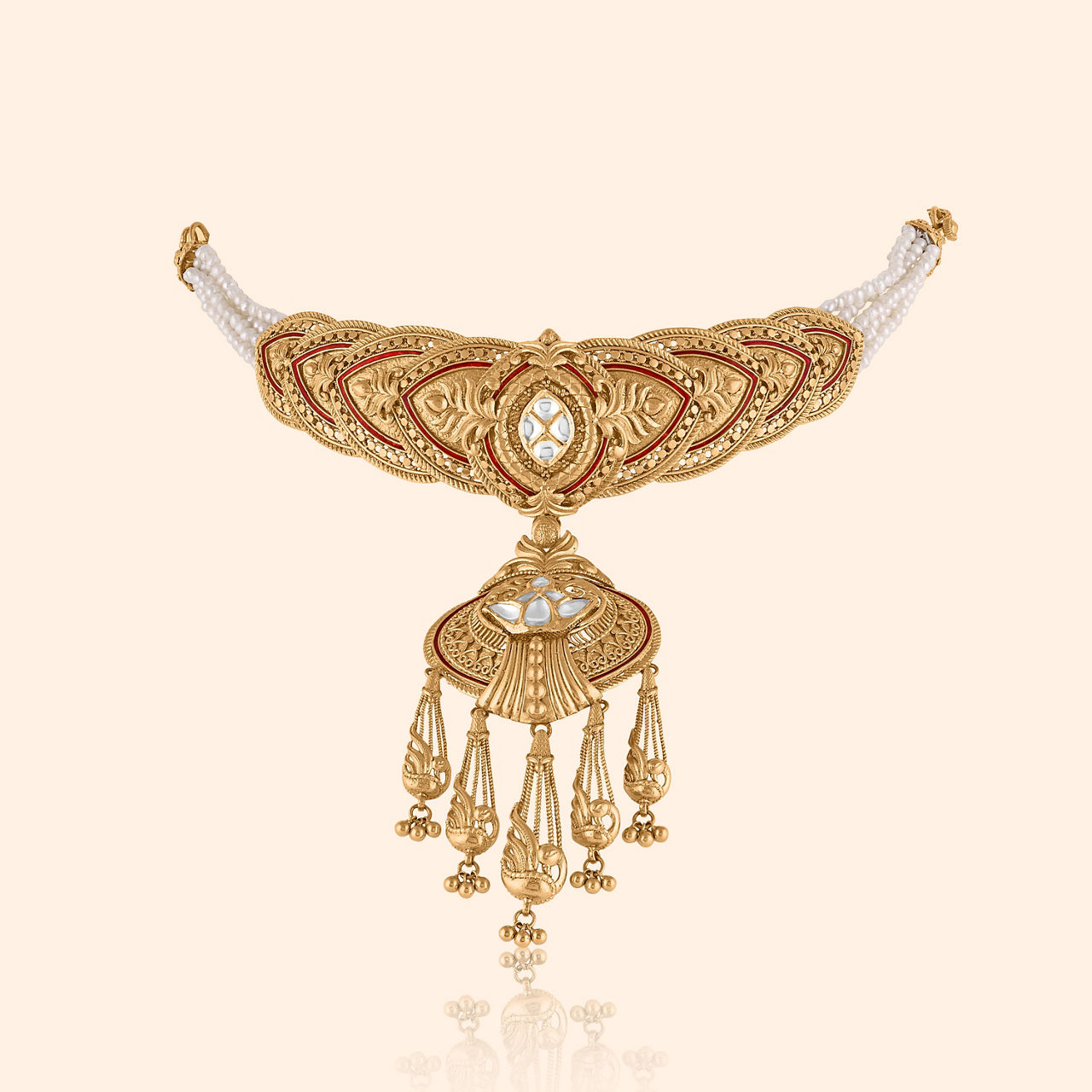 In gold's antique embrace, a whispered lore,For the bride, a timeless promise to adore. Crafted from radiant 22KT yellow gold, these exquisite earrings boast an antique finish that lends them a regal, time-honoured charm. Their elevated traditional design features a harmonious blend of floral motifs and balanced forms, beautifully adorned with lustrous gemstones. Designed for versatility, they feature a clever detachable stud, allowing for diverse styling. Perfect for bridal wear, these stunning earrings will exquisitely complement a heavy silk saree or an ornate lehenga, completing your grand ensemble. Let these earrings be a cherished emblem of your momentous journey, radiating an enduring beauty.