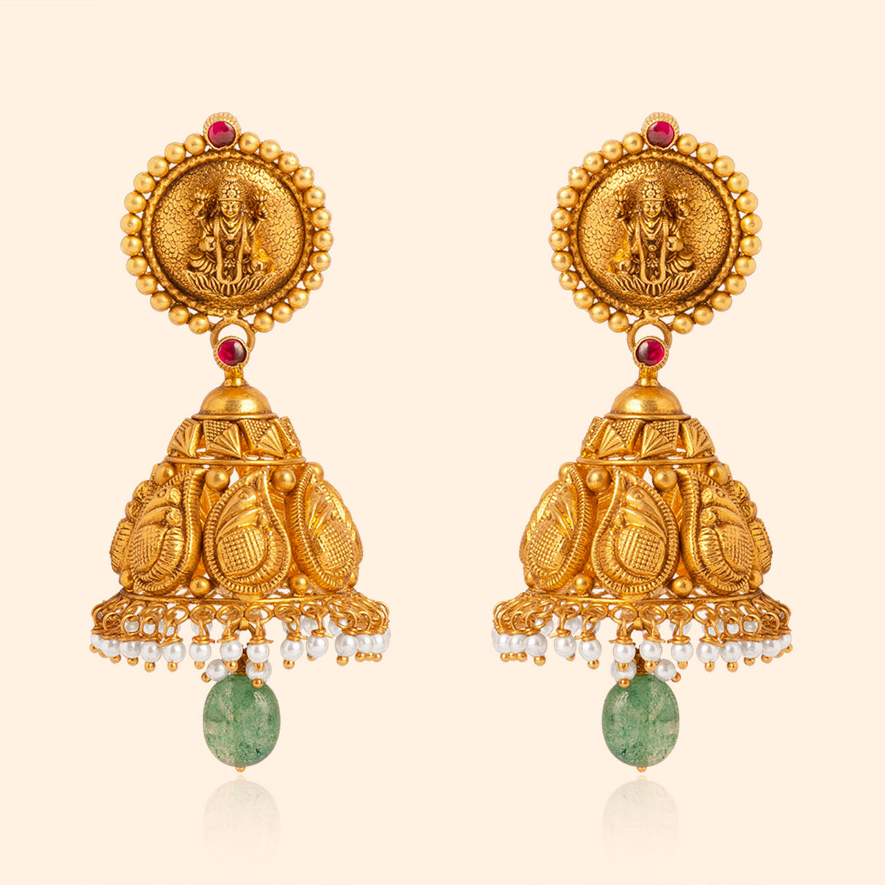 This 22 karat yellow gold choker necklace exudes the essence of divine grace and wealth, inspired by Goddess Laxmi herself. Handcrafted with intricate Nakashi artistry, the jewel features a beautiful symphony of glass kundan, red and green stones, and lustrous pearls. The multicoloured stones shimmer with a divine radiance, while the standard antique finish adds an eternal charm. A perfect embodiment of elevated traditional bridal wear, this necklace is not just a jewel but a symbol of prosperity and beauty. Ideal for your most important occasions, it will transform your bridal look with its divine energy and timeless elegance.