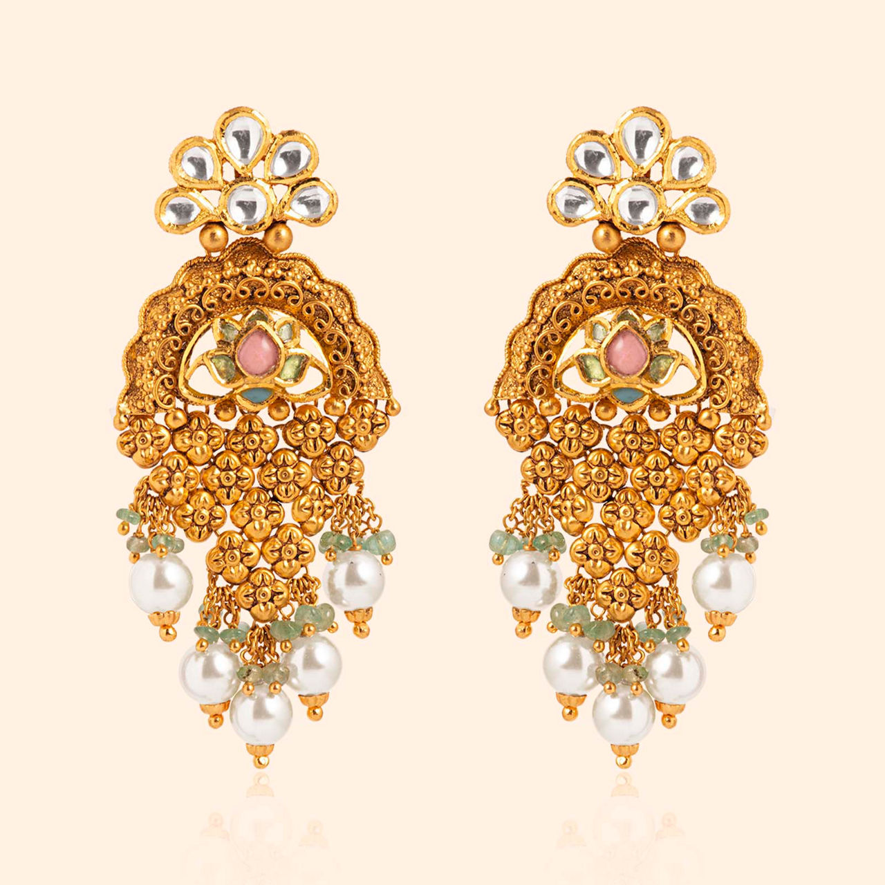 Regal splendour sits close upon the skin, where pearls and vibrant hues begin a story intricate, from deep within. This gold choker is a masterpiece of traditional artistry, designed to adorn the neckline with unparalleled grandeur. Its centerpiece features a stunning semi-circular plaque, showcasing delicate meenakari work, flanked by intricately detailed peacock motifs symbolizing grace and beauty. Multiple strands of lustrous pearls and coloured beads provide an opulent frame, while delicate pearl drops add gentle movement. Crafted in rich 22 karat yellow gold, it is perfect for bridal or grand festive occasions.