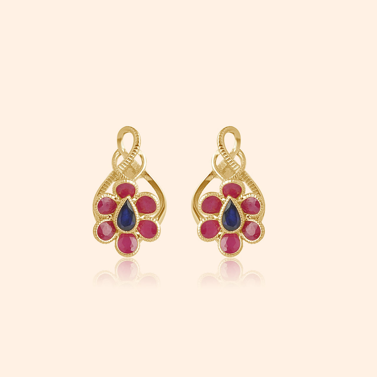 Infinite loops of scarlet flowers gleam, evoking passion's gentle dream where petals softly gleam. This gold necklace features a central floral motif composed of rich red stones, nestled within an elegant infinity loop pendant, symbolising endless affection and vibrant life. Slender blue stones punctuate the delicate chain, adding pops of contrasting colour that enhance the overall allure and unique character of the design. Perfect for adding a touch of sophisticated colour and meaningful design to any ensemble, this necklace is thoughtfully fashioned from brilliant 22 karat yellow gold.