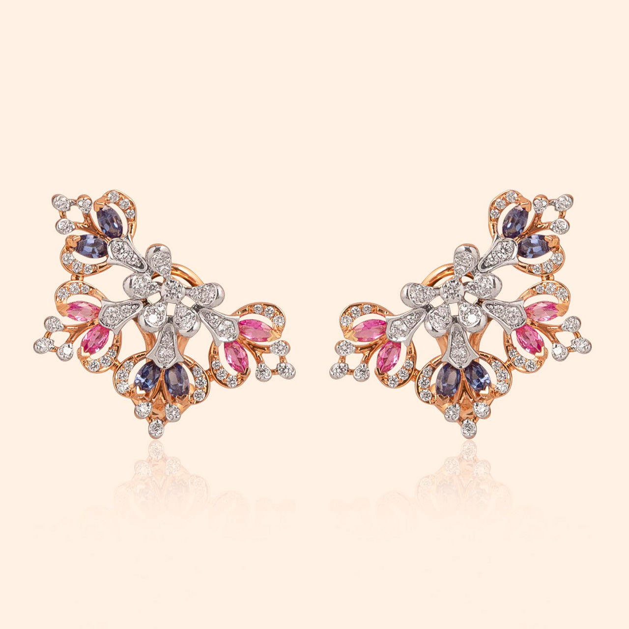 Frozen bloom bursts with unexpected colour like winter flower touched by magic, its crystalline structure holding vibrant secrets within icy diamond embrace near the heart. The kaleidoscope bloom diamond necklace forms intricate snowflake or stylized floral silhouette, uniquely adorned not only with dazzling diamonds but also with vivid pink and blue sapphires adding delightful bursts of colour. This elevated essential piece offers modern elegance with playful twist, set in lustrous 18 karat pink gold.