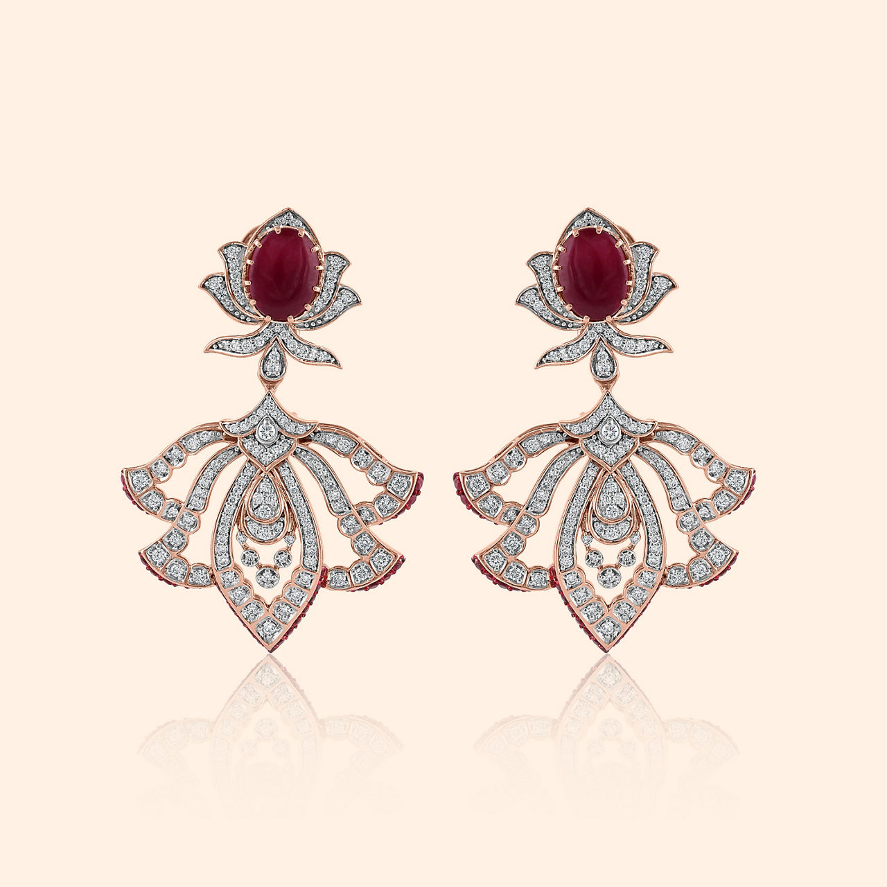 Where vibrant hues and diamonds meet, a grand design, luxuriously sweet. Crafted in radiant 14KT rose gold, this necklace, with its high polish finish, presents a captivating modern floral design. At its heart, a vibrant red gemstone is embraced by dazzling brilliant diamonds, creating a symphony of light and color. The exquisite pendant is detachable, offering versatile styling options to complement your grandest ensembles. Adorn yourself with this masterpiece, perfect for heavy occasion wear, enhancing the splendor of a heavy silk saree or an elaborate lehenga.