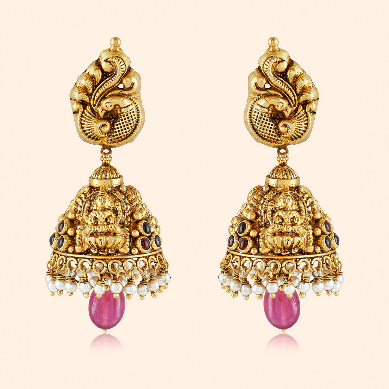 A divine goddess resides in gold's embrace, bringing fortune, prosperity, and grace — lighting up this sacred space. This necklace is a magnificent example of temple jewellery artistry, featuring an elaborate pendant depicting Goddess Lakshmi, symbolizing wealth and auspiciousness, set within an intricately detailed long haar. The necklace comprises multiple layers of traditional motifs, beads, and coloured stone accents, showcasing the exceptional craftsmanship characteristic of South Indian temple designs. This piece carries deep spiritual significance and represents a wearable work of art. Fashioned from opulent 22 karat yellow gold, it embodies devotion, heritage, and unparalleled grandeur.