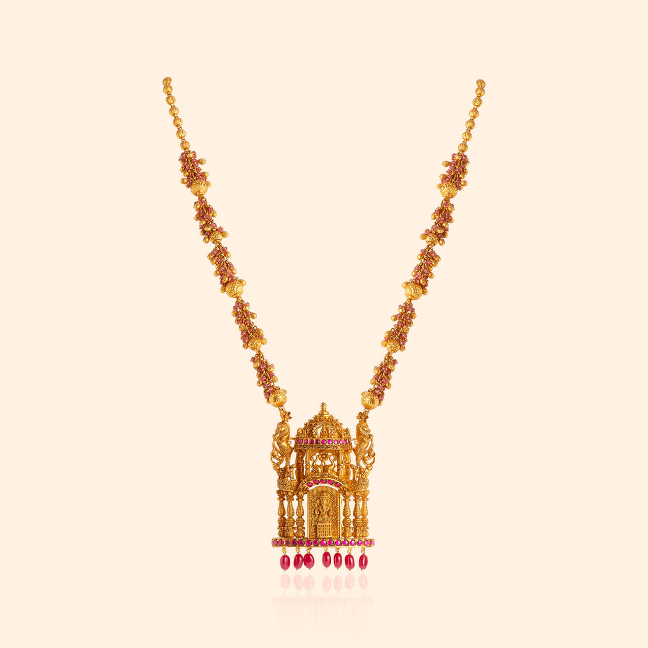 Grace divine in radiant frame, blessings shine in every flame. The Lakshira Drop Earrings, fashioned in 22KT yellow gold, feature a traditional Goddess Laxmi motif adorned with gemstones. With their standard antique finish, these earrings embody spiritual elegance and timeless craftsmanship, making them ideal for heavy occasion wear and religious celebrations. They merge divine symbolism with artistic detailing, offering women not just a jewel, but a powerful emblem of prosperity, grace, and eternal blessings.
