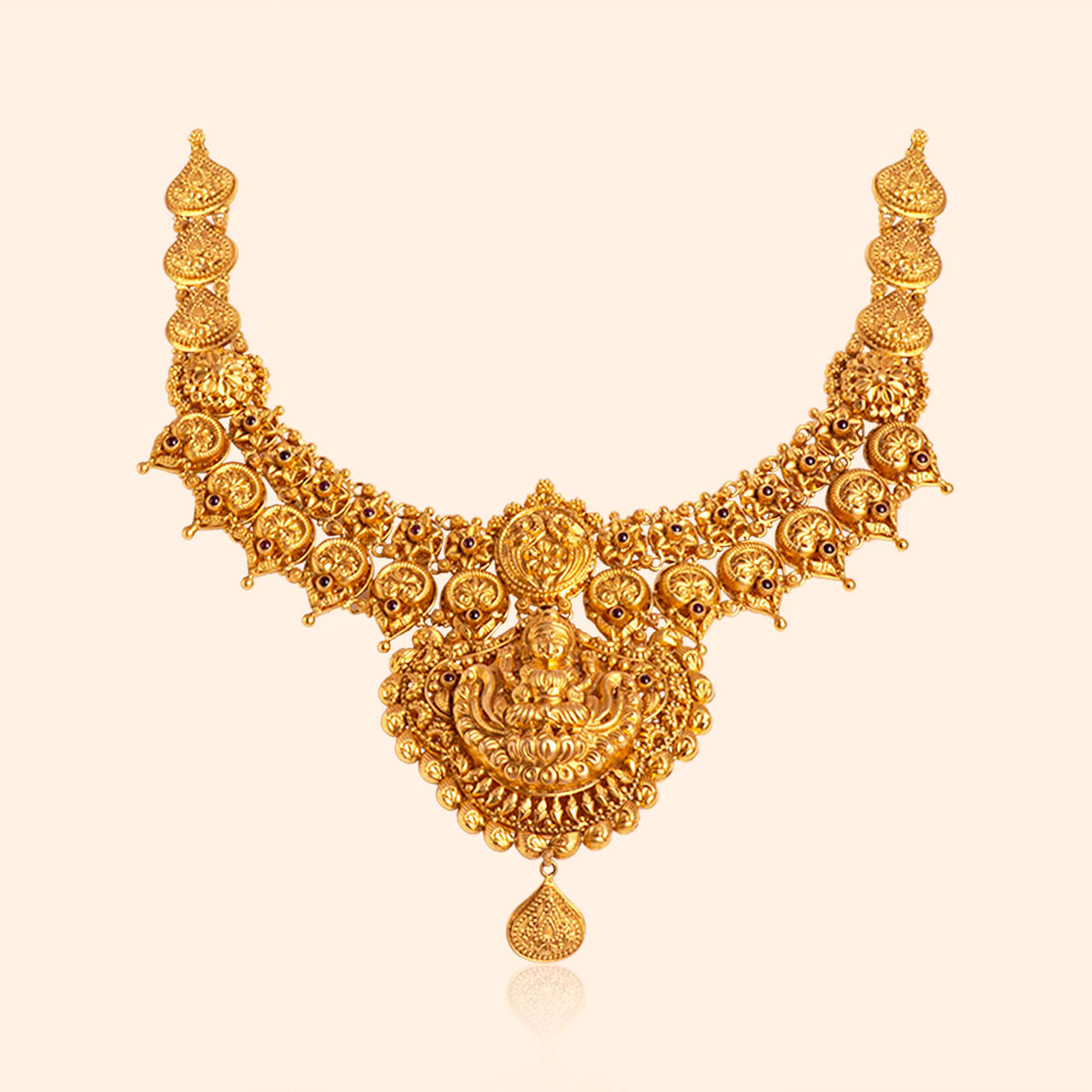 This necklace, crafted in 22KT yellow gold, is an ode to nature's grace. Its antique finish enhances the intricate floral design, adorned with gemstones pink and green stones and pearls that add vibrant charm. The detachable feature offers versatility, making it perfect for light occasion wear. Radiating elegance and tradition, this necklet is a symbol of timeless beauty and refined artistry, designed to elevate your every look.