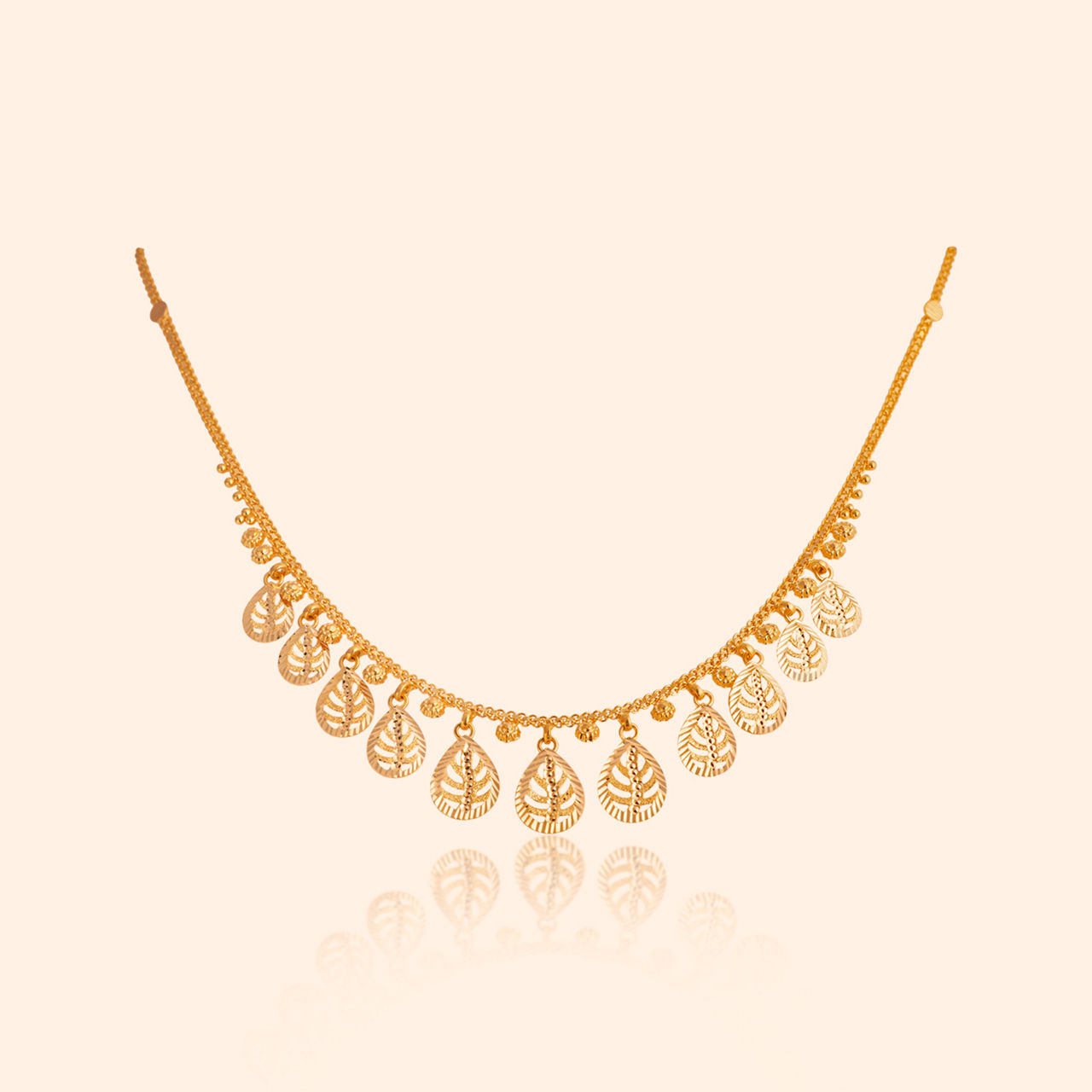 Twin leaves of gold descend with nature's gentle grace refined, delicate beauty for heart and mind, leaving simpler worlds behind. These charming drops feature a two-part composition—a smaller leaf at the stud and a larger one gently swaying below. Intricate veining and fine texture add lifelike detail to both elements, allowing the forms to catch the light with natural elegance. Lightweight and classic, these are crafted from gleaming 22 karat yellow gold, ideal for daily wear.
