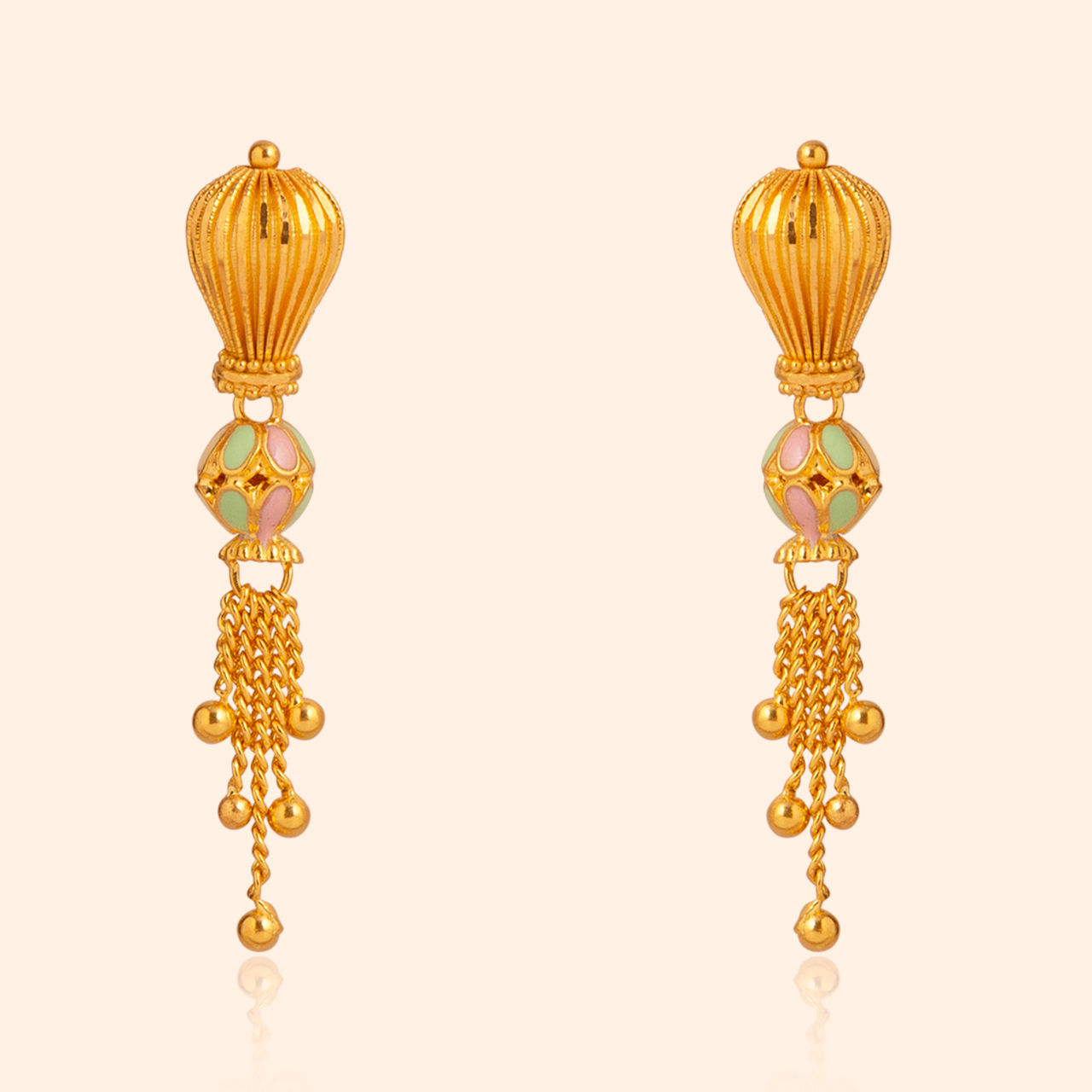 A golden melody flows down in shimmering stream, like sunlit waterfall or whispered sweet dream, capturing light’s gentle gleam. This gold necklace features a captivating barrel-shaped pendant, detailed with delicate meenakari, suspended gracefully from a finely woven gold chain interspersed with textured beads enhancing its opulent feel. This central element gives way to a flowing cascade of polished gold tassels, creating a sense of fluid elegance and rhythmic movement. It’s a unique blend of traditional inspiration and modern execution, meticulously rendered in luminous 22 karat yellow gold.