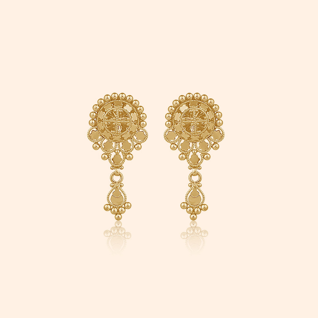 Golden spheres form a necklace reminiscent of traditional temple jewellery, where each bead and an intricate central pendant reflect timeless devotional artistry. The necklace displays a meticulously crafted chain of gold beads leading to an ornate circular pendant with a delicate drop, evoking classic elegance. Adorn yourself with this piece rich in heritage and grace, beautifully fashioned from radiant 22 karat yellow gold.