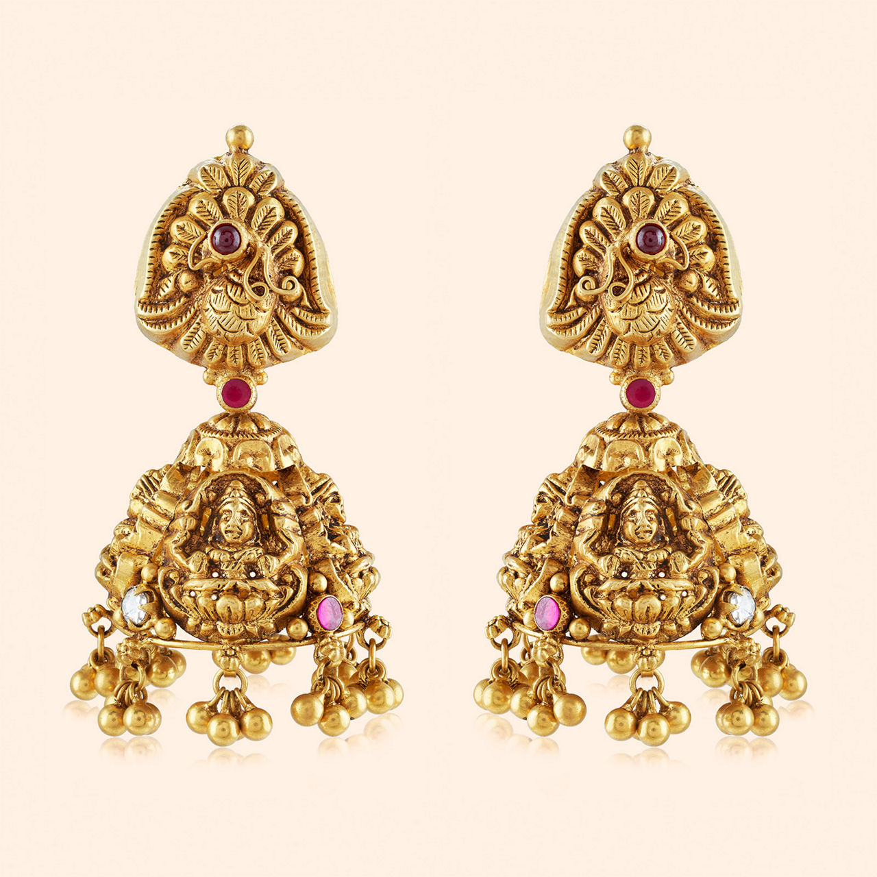 Where ancient lore meets golden grace, a goddess's blessing finds its hallowed place. This magnificent 22KT yellow gold necklace, with its rich antique finish, is a homage to timeless artistry. It features an exquisitely handmade Lakshmi Nakshi motif at its heart, surrounded by delicate details and subtle red gemstones, evoking a sense of divine prosperity. Perfect for light occasion wear, this piece will beautifully complement a flowing chiffon saree or a festive kurta set, gracing your presence with an aura of tradition and elegance.