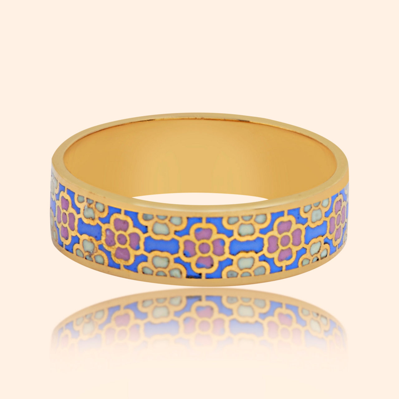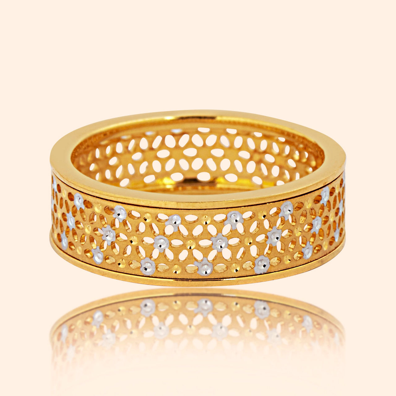 This 22 karat yellow gold band is a timeless expression of ethno-contemporary artistry, featuring an elegant foliage design. The antique finish enhances its depth and character, making it a refined essential for your collection. Designed for elevated everyday wear, it brings a graceful sophistication to your fingers, complementing both modern and traditional ensembles. Whether worn alone or stacked with other rings, this piece embodies understated elegance with a touch of heritage, ensuring it remains a cherished symbol of style and craftsmanship.