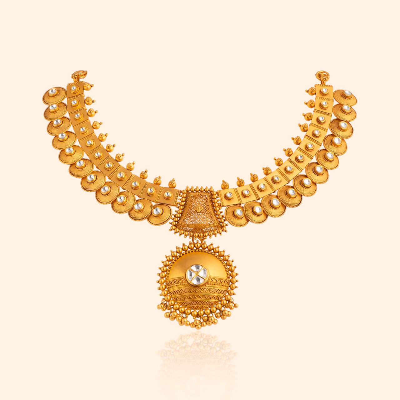 Radiant discs like the sun at highest noon hold ancient patterns 'neath the silent moon — tradition's echo coming soon. These stud earrings present a bold statement with their large, circular design reminiscent of a sun disc or ornate shield. Central polki stones provide the focal point, surrounded by intricate traditional patterns, featuring filigree or antique texturing, and bordered by fine golden beads that add subtle movement. Offering substantial presence and timeless Indian artistry, they are perfect for festive wear and crafted with meticulous detail in rich 22 karat yellow gold.