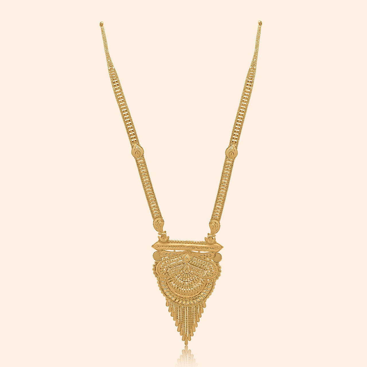 Intricate windows frame your golden grace, as tassels dance apace. These festive earrings begin with an ornate stud, flowing into an elaborate central element featuring delicate filigree or cutwork. They culminate in a cascade of multiple dangling teardrop tassels that sway with every movement. A joyful expression of craftsmanship in glowing 22 karat yellow gold.