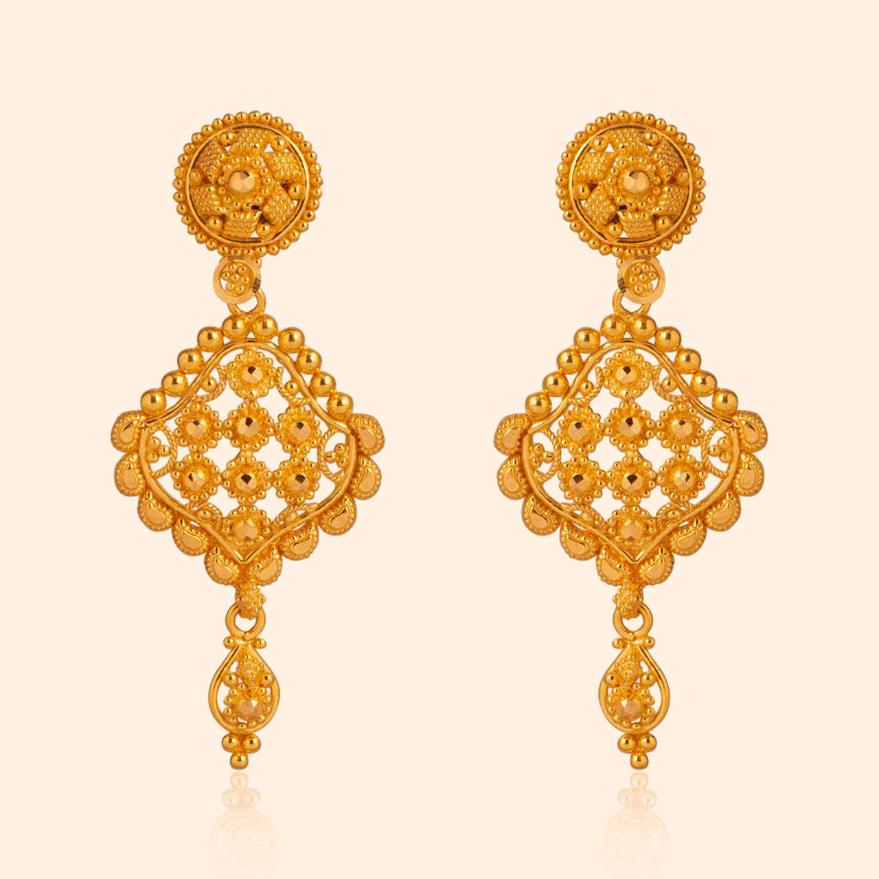Golden lines in structured gleam, geometry shaped into a dream. The Orivianne Diamond Drop Earrings, designed in 18KT yellow gold with SI-FG stones, feature a clean geometric motif. Belonging to the daily wear essentials, they offer elevated traditional appeal while staying lightweight and versatile. Their high-polish finish ensures radiant elegance, making them perfect for both everyday styling and semi-formal settings. Balanced between heritage design and contemporary sensibility, these earrings add subtle sophistication to any look.