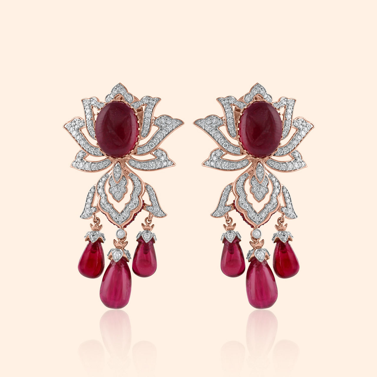 From a vibrant heart, a bloom unfurls, as diamonds dance in gilded swirls. Crafted in lustrous 14KT rose gold with a high polish finish, this necklet features a captivating central pink stone, surrounded by brilliant diamonds forming an exquisite floral motif. Its modern design gracefully cascades into delicate drops, shimmering with every movement. This piece is destined to adorn your most treasured heavy occasion wear, perfecting a grand lehenga or a magnificent silk saree, ensuring you radiate timeless charm.