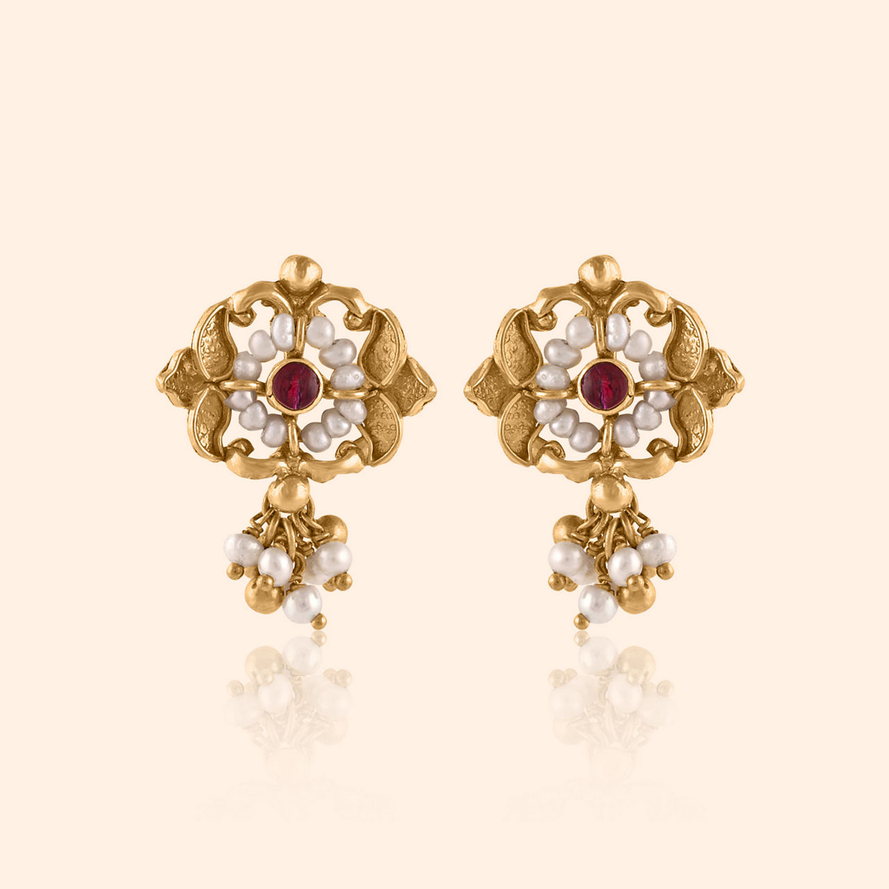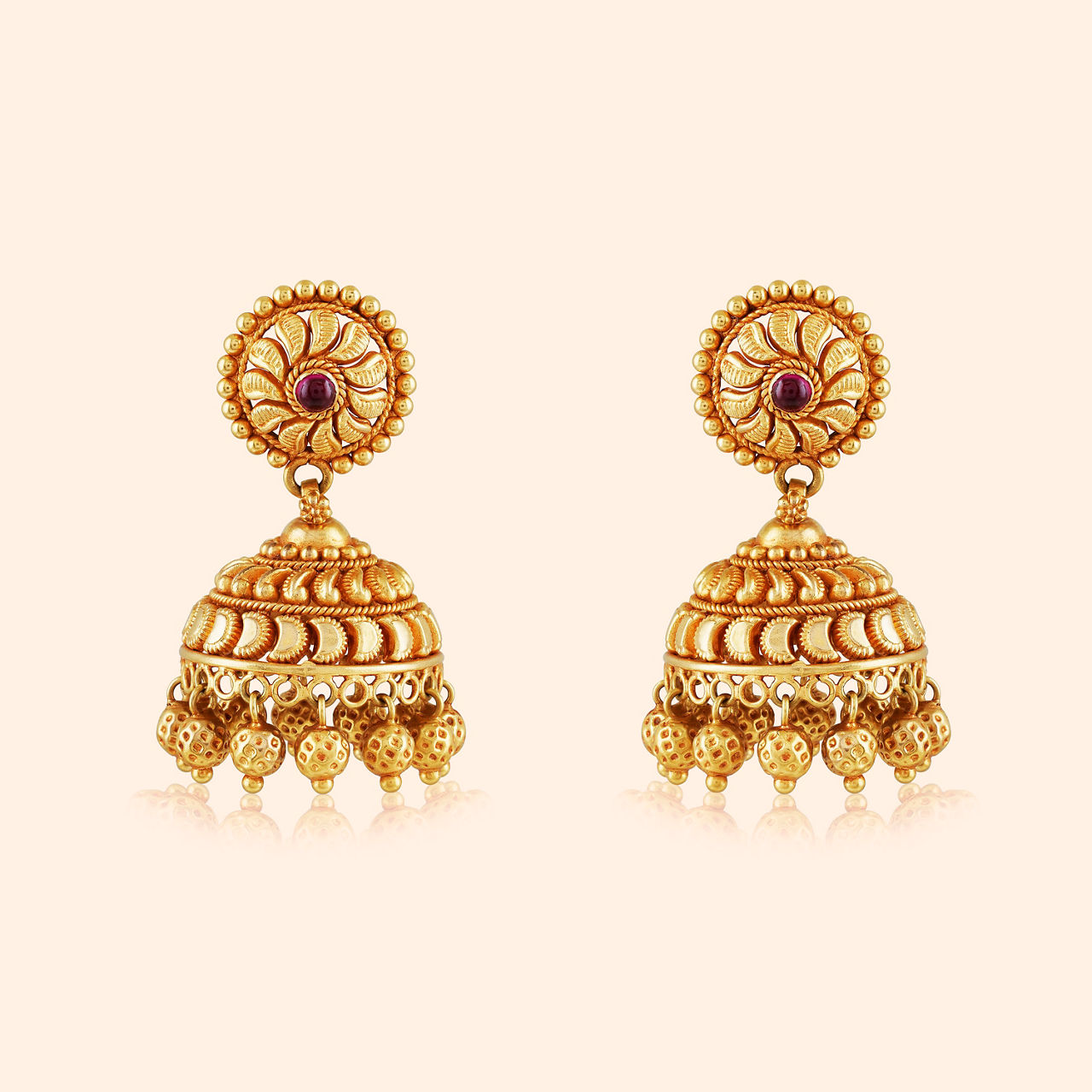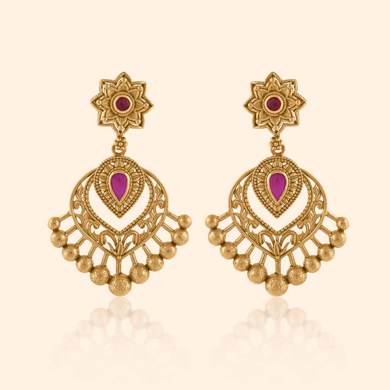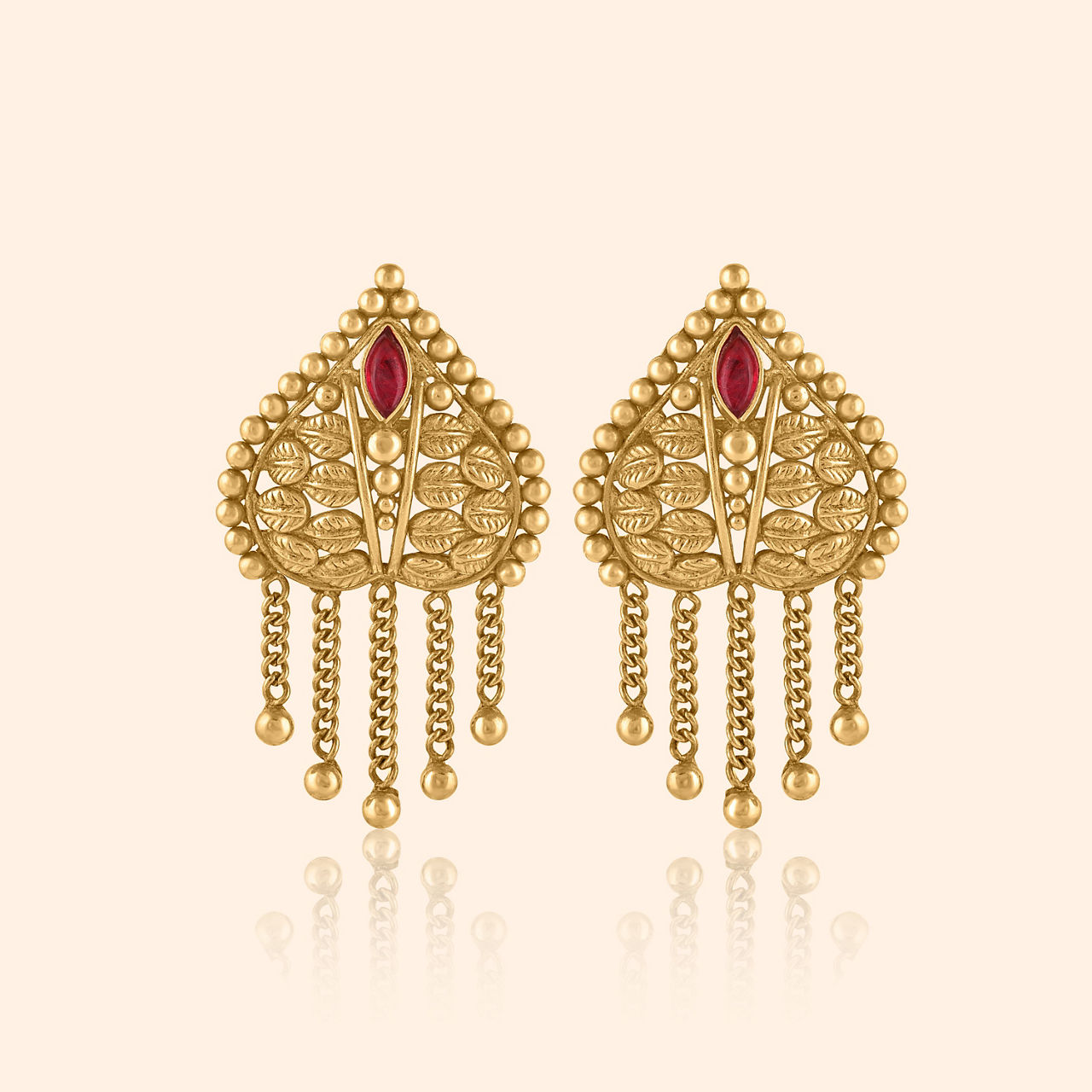 Floral medallions bloom with ancient grace untold, centred with ruby fire, stories to unfold, dangling golden droplets, precious to behold. These earrings embody classic traditional design, featuring intricate floral studs detailed with fine granulation and centred with a rich red stone. Below the main motif, delicate golden beads (ghungroos) dangle, adding gentle sound and movement. These earrings are perfect for elevated ethnic wear, radiating festive charm and artisanal heritage. Crafted beautifully in timeless 22 karat yellow gold, they capture the essence of celebration.