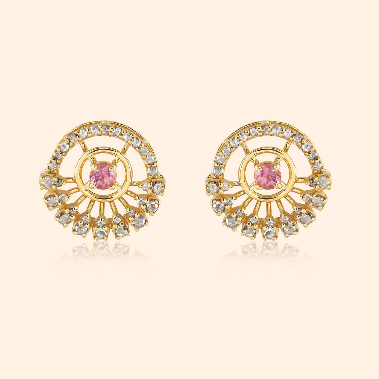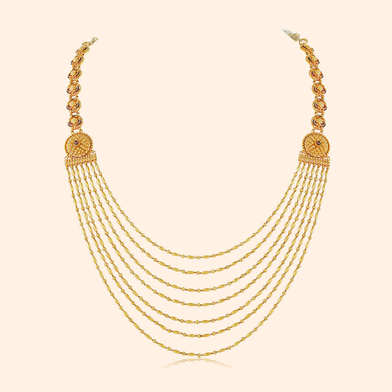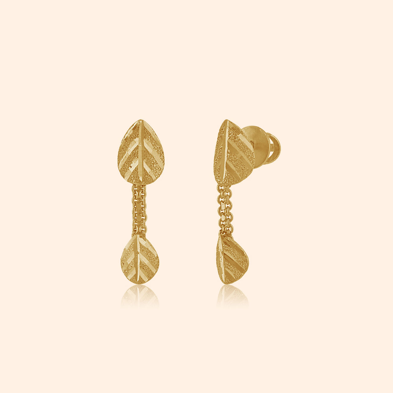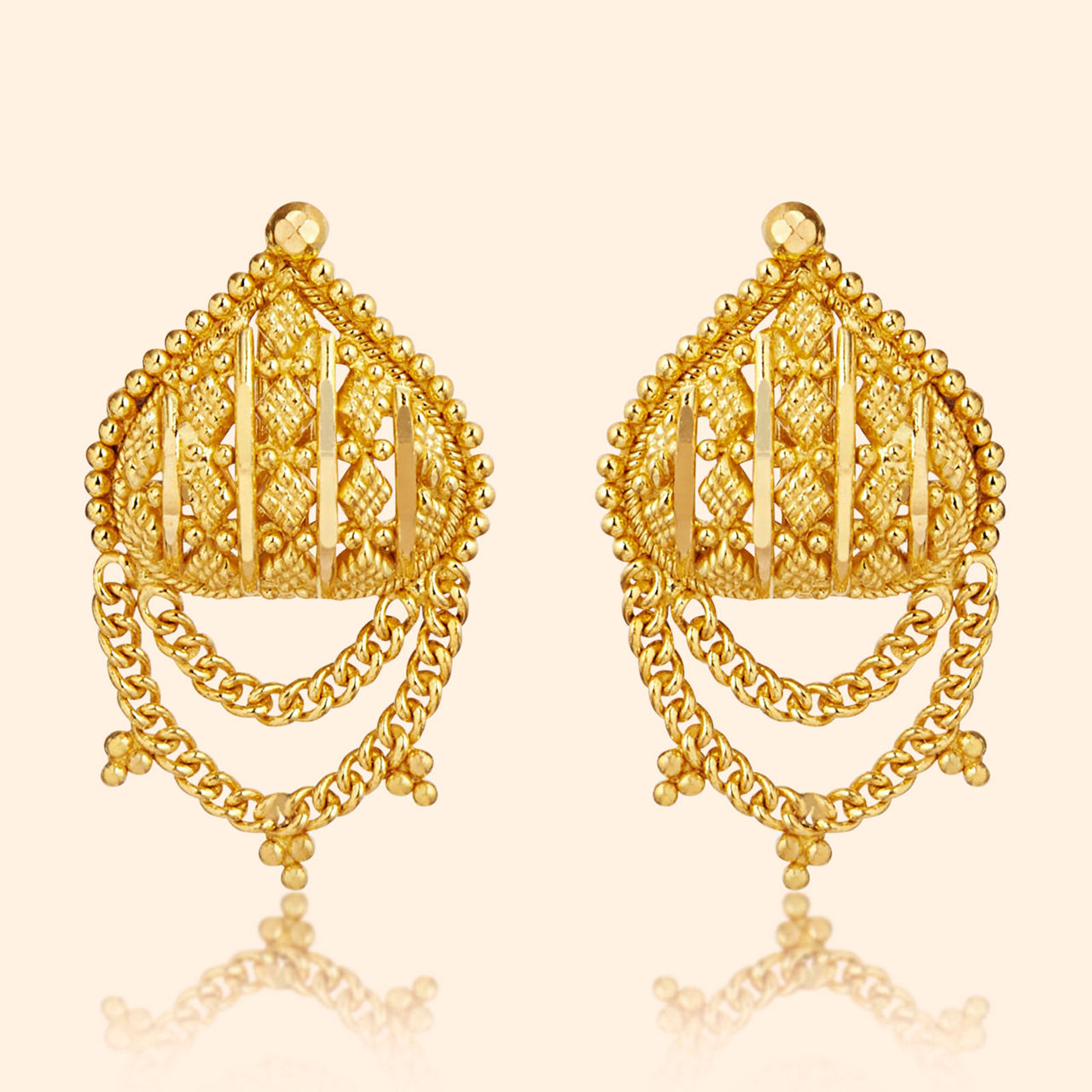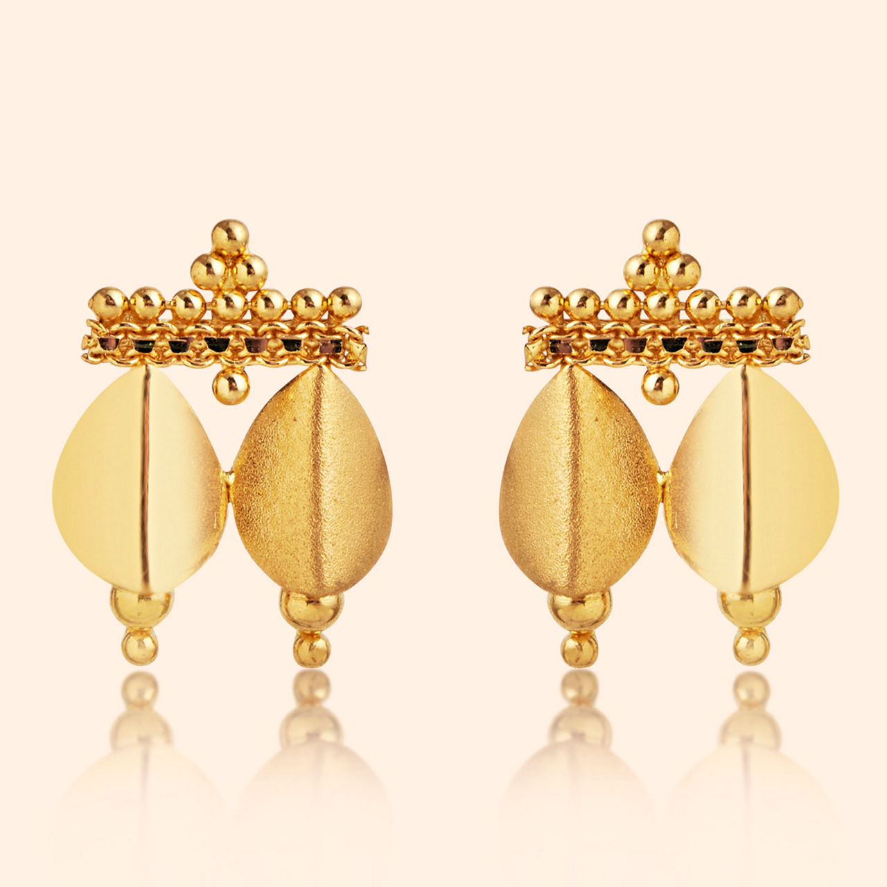 Floral medallions bloom with ancient grace untold, centred with ruby fire, stories to unfold, dangling golden droplets, precious to behold. These earrings embody classic traditional design, featuring intricate floral studs detailed with fine granulation and centred with a rich red stone. Below the main motif, delicate golden beads (ghungroos) dangle, adding gentle sound and movement. These earrings are perfect for elevated ethnic wear, radiating festive charm and artisanal heritage. Crafted beautifully in timeless 22 karat yellow gold, they capture the essence of celebration.