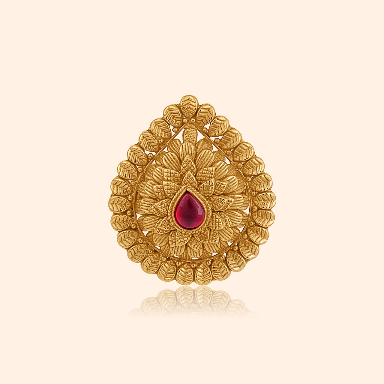 A magnificent blossom unfolds in the sun's warm rays, a golden statement piece for bright and festive days, drawing admiring gaze always. This ring is designed to captivate attention with its grand scale and exquisite detailing. It features a large, beautifully rendered floral design at the center, petals unfurling with grace. The intricate openwork, reminiscent of traditional jaali, lends an airy feel despite its size, allowing light to pass through. Encircling the bloom is a delicate border of tiny gold beads, adding further texture and refinement. Crafted with exceptional skill in radiant 22 karat yellow gold, it's perfect for ladies making a bold statement.
