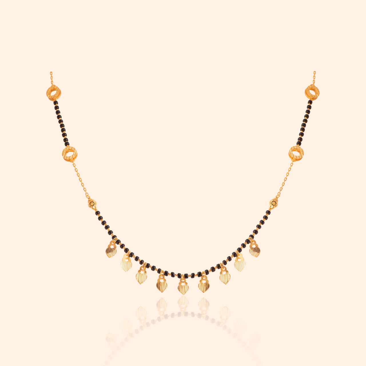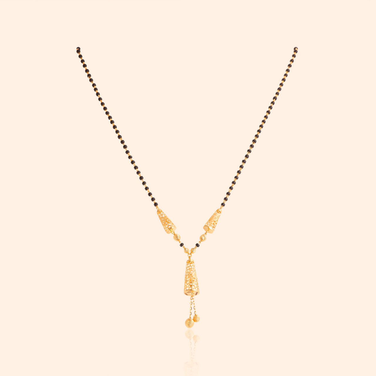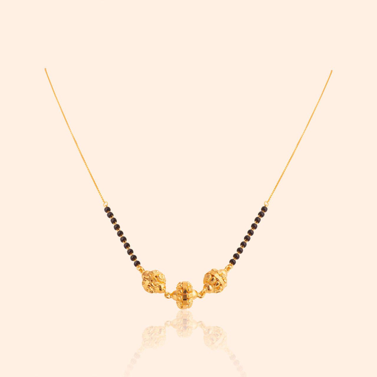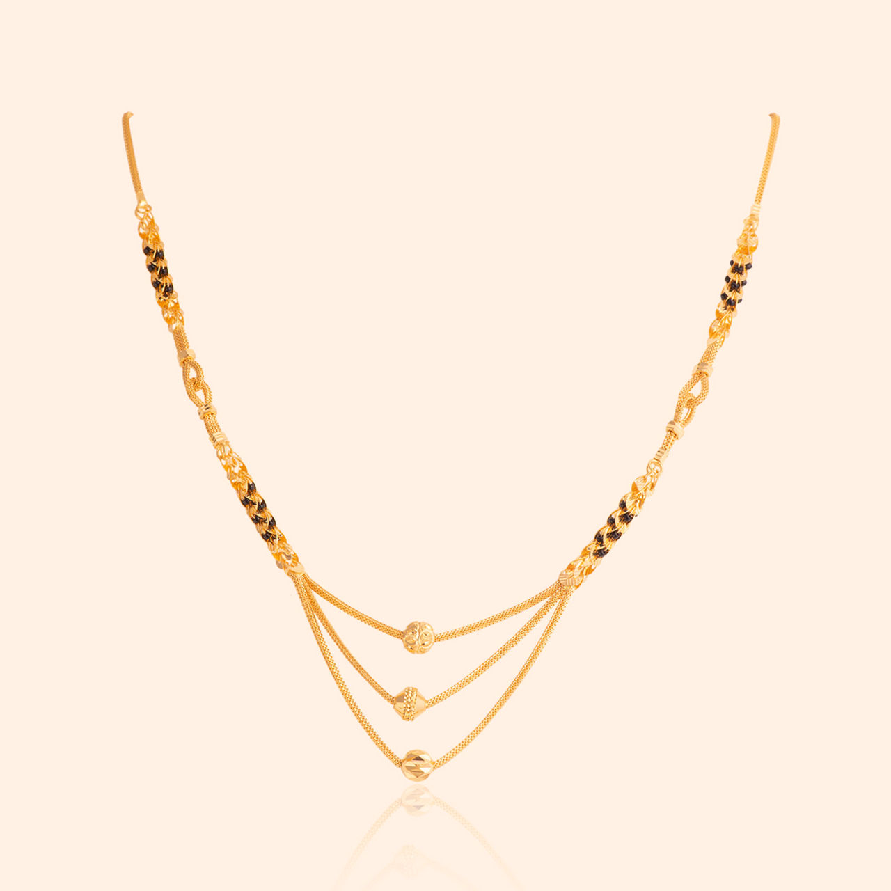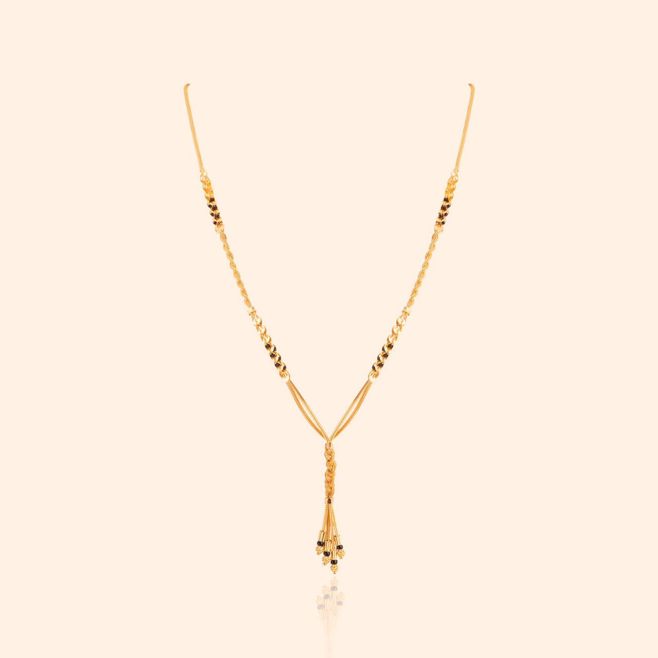 A sacred bond shines with a pendant’s gleam, fulfilling cherished, hopeful dream, flowing like life’s eternal stream. This elegant mangalsutra features a beautifully crafted central pendant with a traditional bulbous shape and granulated detailing, suspended from a classic black beaded chain interspersed with golden accents. It symbolises marital bliss with grace and subtlety. Fashioned from luminous 22 karat yellow gold, it represents an enduring symbol of love and commitment, designed for daily wear while retaining its sacred significance.