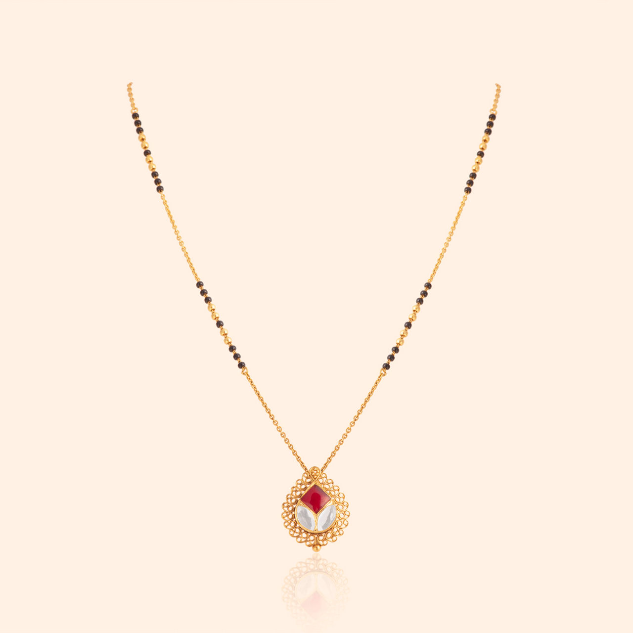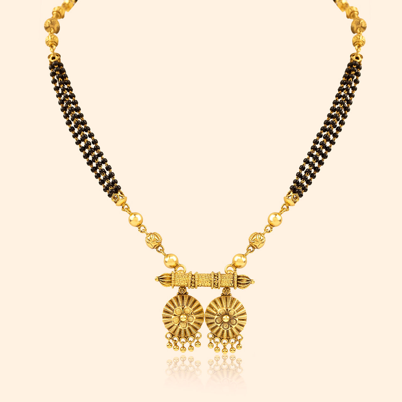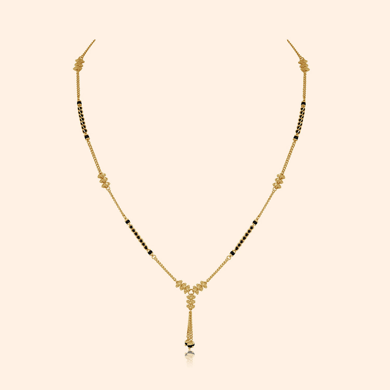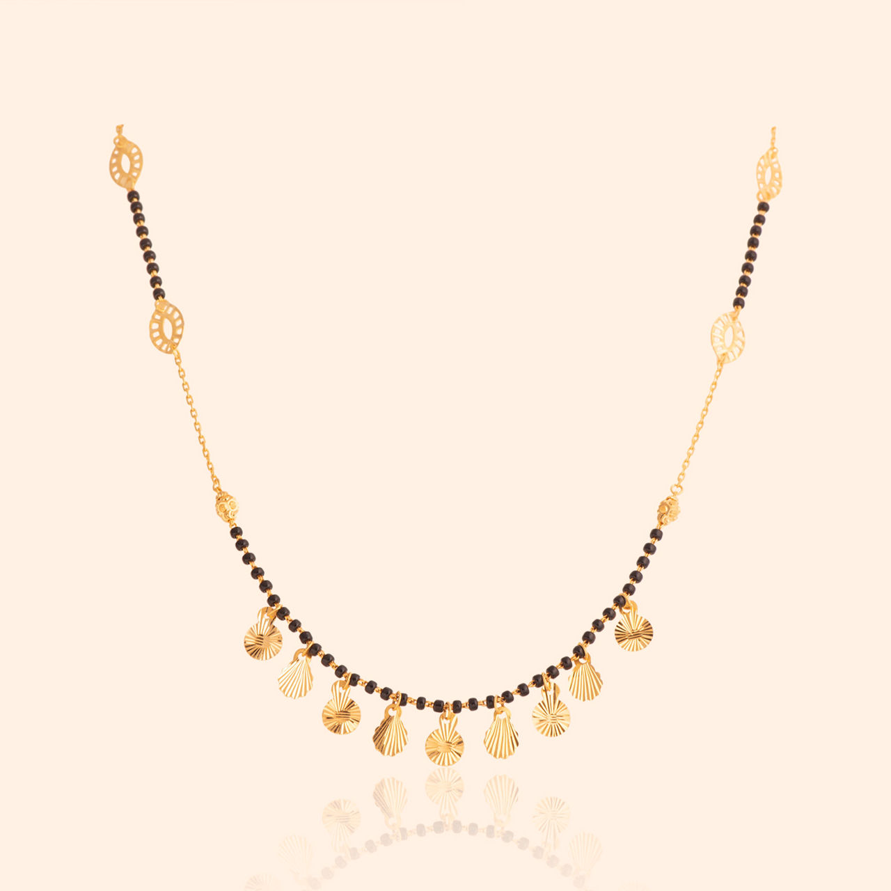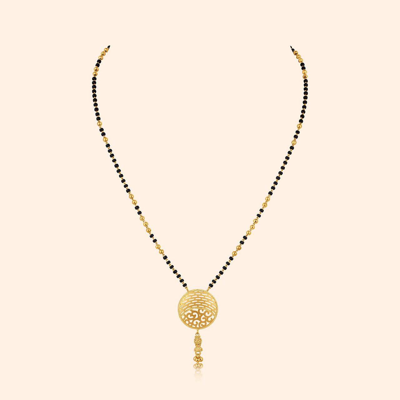 A sacred bond shines with a pendant’s gleam, fulfilling cherished, hopeful dream, flowing like life’s eternal stream. This elegant mangalsutra features a beautifully crafted central pendant with a traditional bulbous shape and granulated detailing, suspended from a classic black beaded chain interspersed with golden accents. It symbolises marital bliss with grace and subtlety. Fashioned from luminous 22 karat yellow gold, it represents an enduring symbol of love and commitment, designed for daily wear while retaining its sacred significance.
