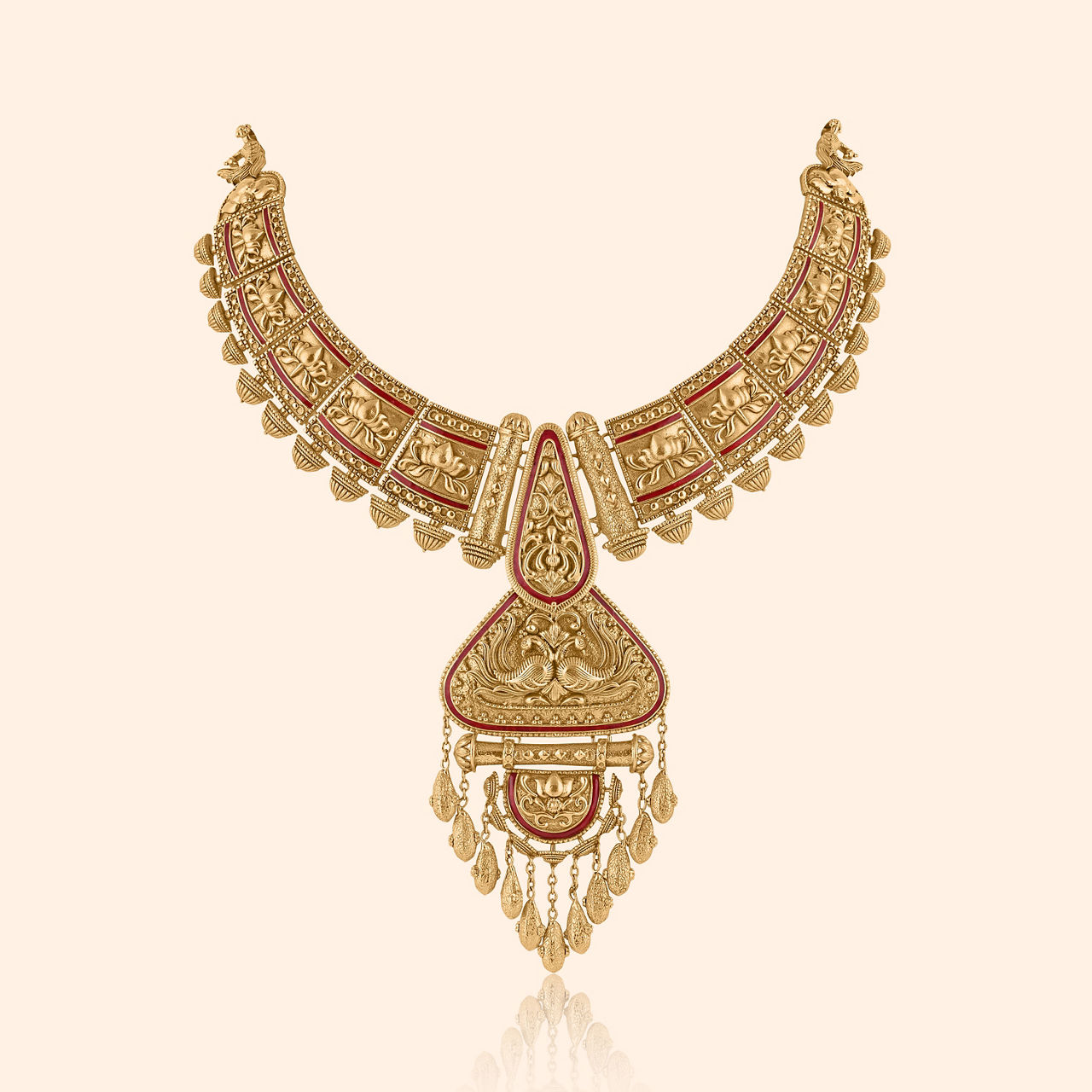 Adorned in traditions' deep embrace, a bride's dream finds its sacred space. Crafted in radiant 22KT yellow gold, these exquisite bridal drop earrings showcase an elevated traditional design, brought to life with a rich antique finish. Intricate floral and harmonious geometric patterns intertwine, creating a grand silhouette reminiscent of heritage artistry. Each curve and drop speaks of timeless celebrations, making them an essential adornment for your most significant day. They beautifully complement a majestic heavy silk saree or an intricately embroidered lehenga, completing your bridal splendor. Let these earrings be a luminous testament to your cherished beginnings and a treasured heirloom for generations to come.