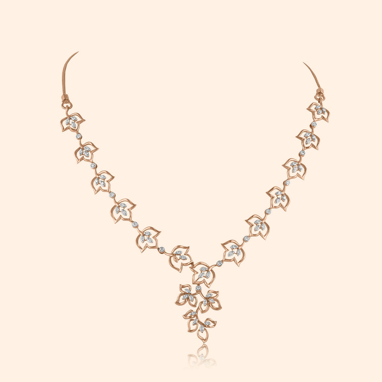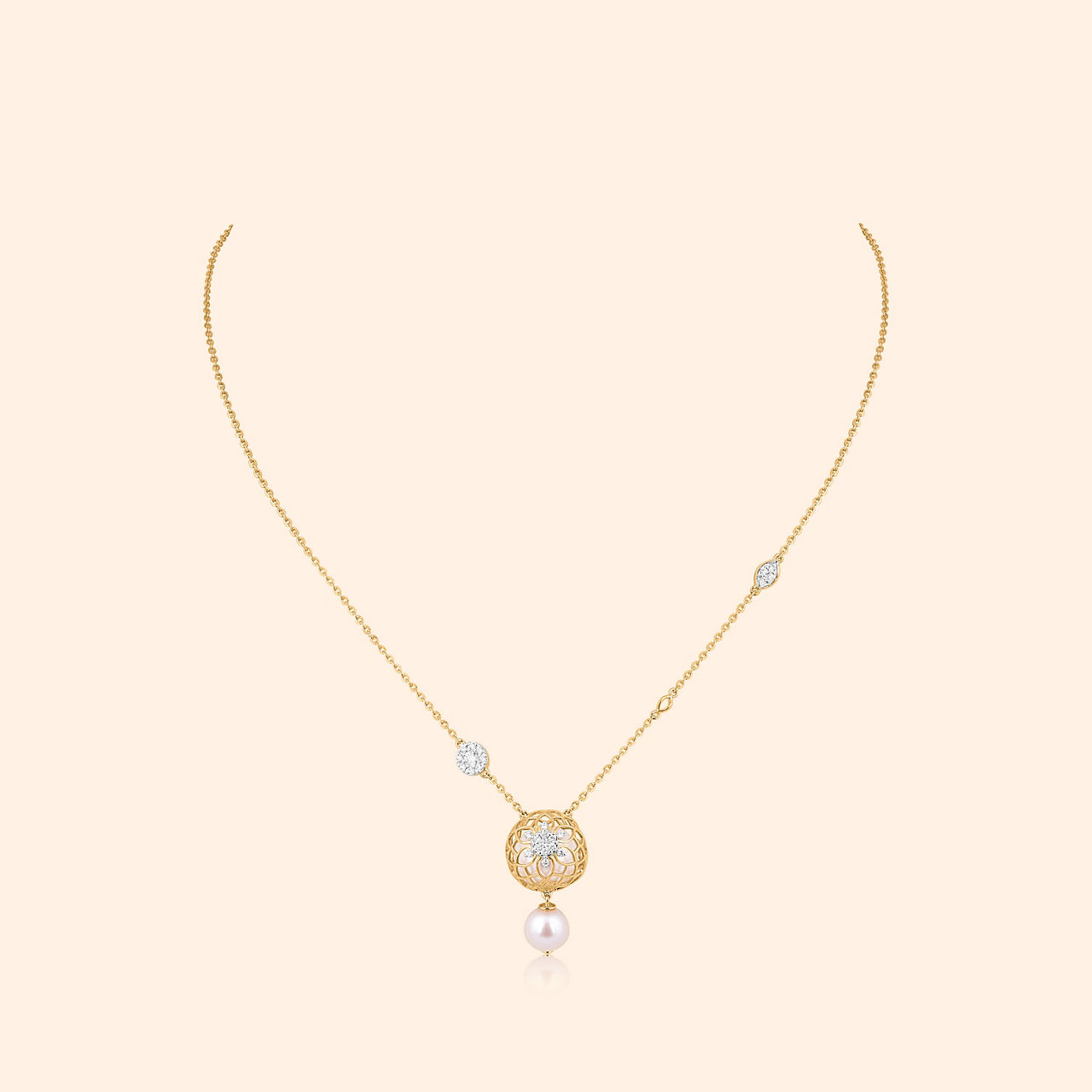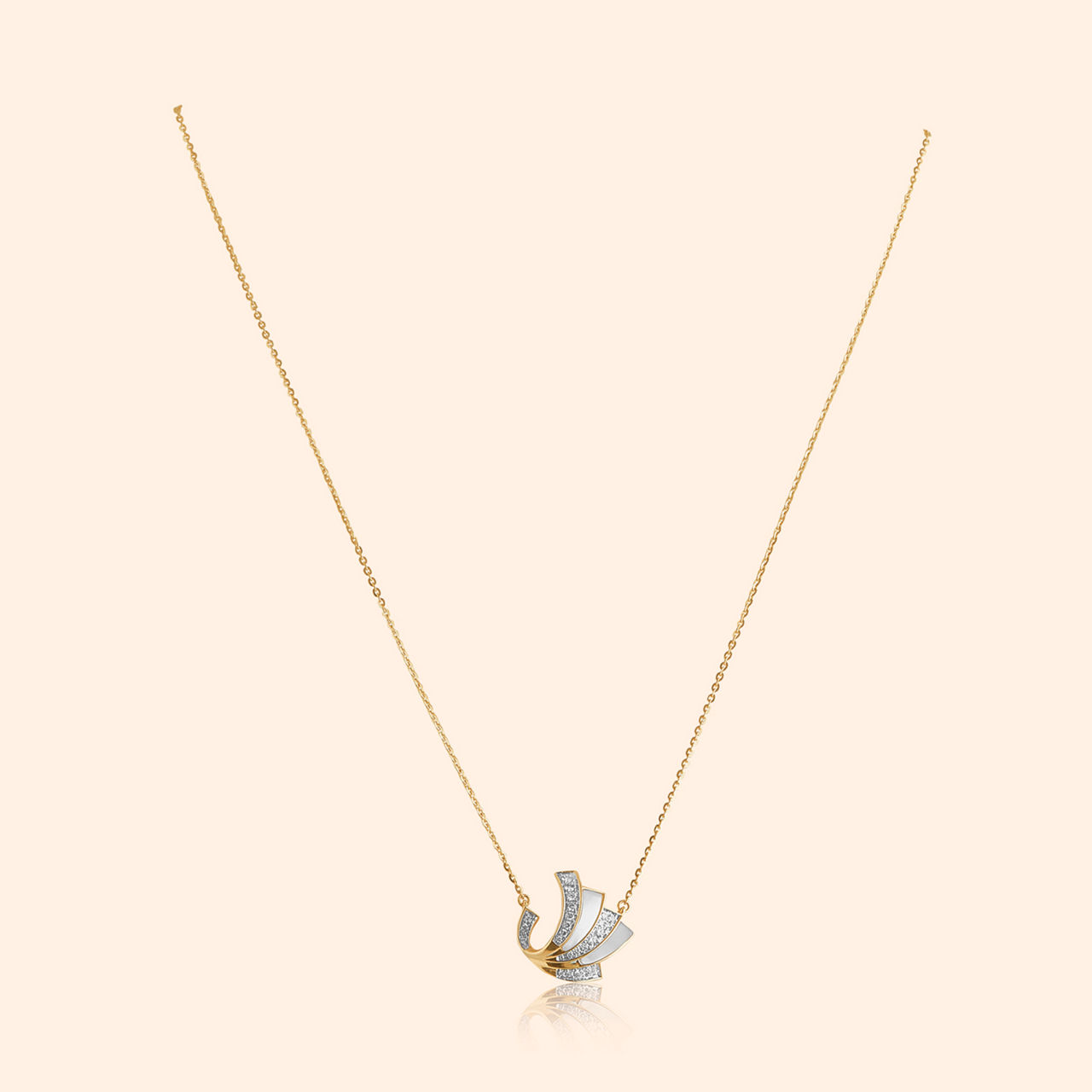 Delicate golden layers descend with geometric grace, two fine chains holding charms that find their perfect space, enhancing beauty’s trace. This necklace offers a contemporary layered look in a single piece, perfect for effortless style. Two delicate chains of varying lengths are adorned with small, identical geometric charms featuring intricate patterns, creating subtle yet eye-catching dimension. It is a versatile addition to any jewellery collection, ideal for adding a touch of modern sophistication, crafted in gleaming 22 karat yellow gold.