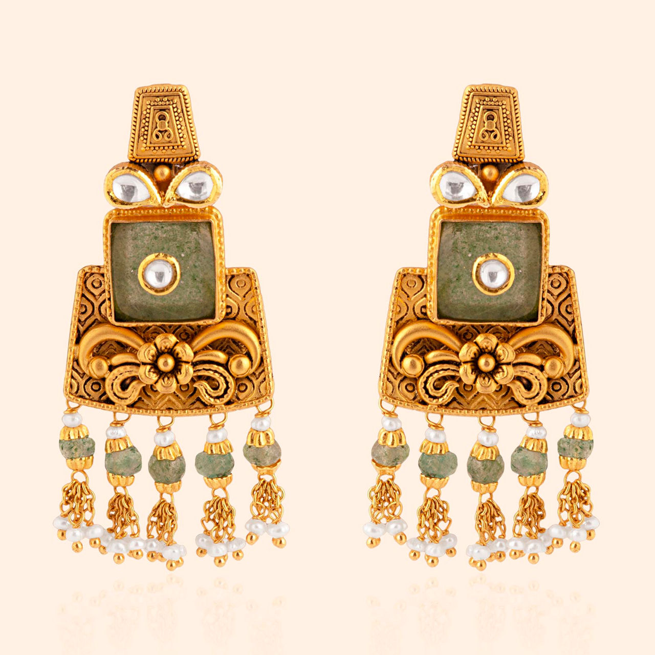 Ancient grandeur echoes forth from antique-finished bold gold, a regal statement resting near with stories to be told. This substantial short necklace exudes an air of timeless majesty, featuring a series of robust, geometrically inspired links set with uncut stones, leading to a magnificent central pendant. The pendant boasts intricate carvings and a central floral motif, enhanced by dangling green beads and pearls. This necklace feels like a treasured heirloom, crafted with impressive detail in venerable 22 karat yellow gold.