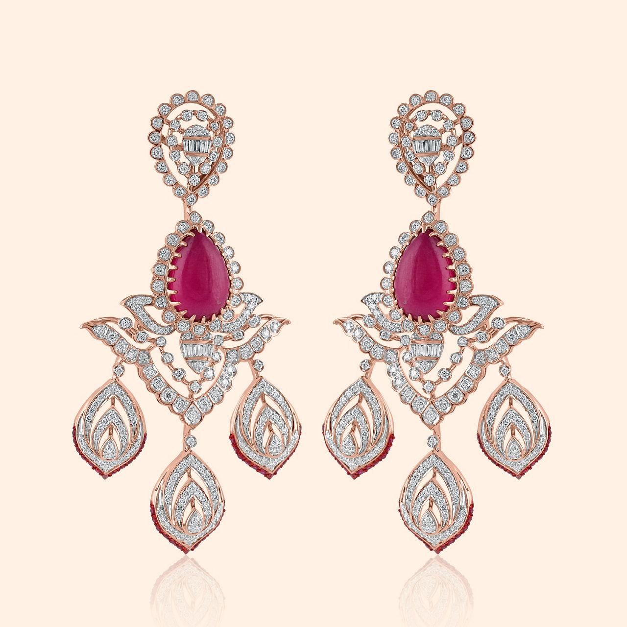 Where crimson whispers meet a diamond's gleam,A symphony of grandeur, a cherished dream.Crafted in radiant 14KT rose gold, polished to a brilliant gleam, this exquisite necklace is a modern masterpiece. A vibrant red gemstone forms its heart, surrounded by a captivating floral motif of brilliant diamonds, each stone meticulously set to create an intricate dance of light. Its ingenious design includes a detachable pendant, offering versatile styling options. Perfect for heavy occasion wear, this statement piece will beautifully complement a luxurious heavy silk saree or an ornate lehenga, ensuring you captivate every gaze. Let this be your crowning glory, a testament to your radiant presence.