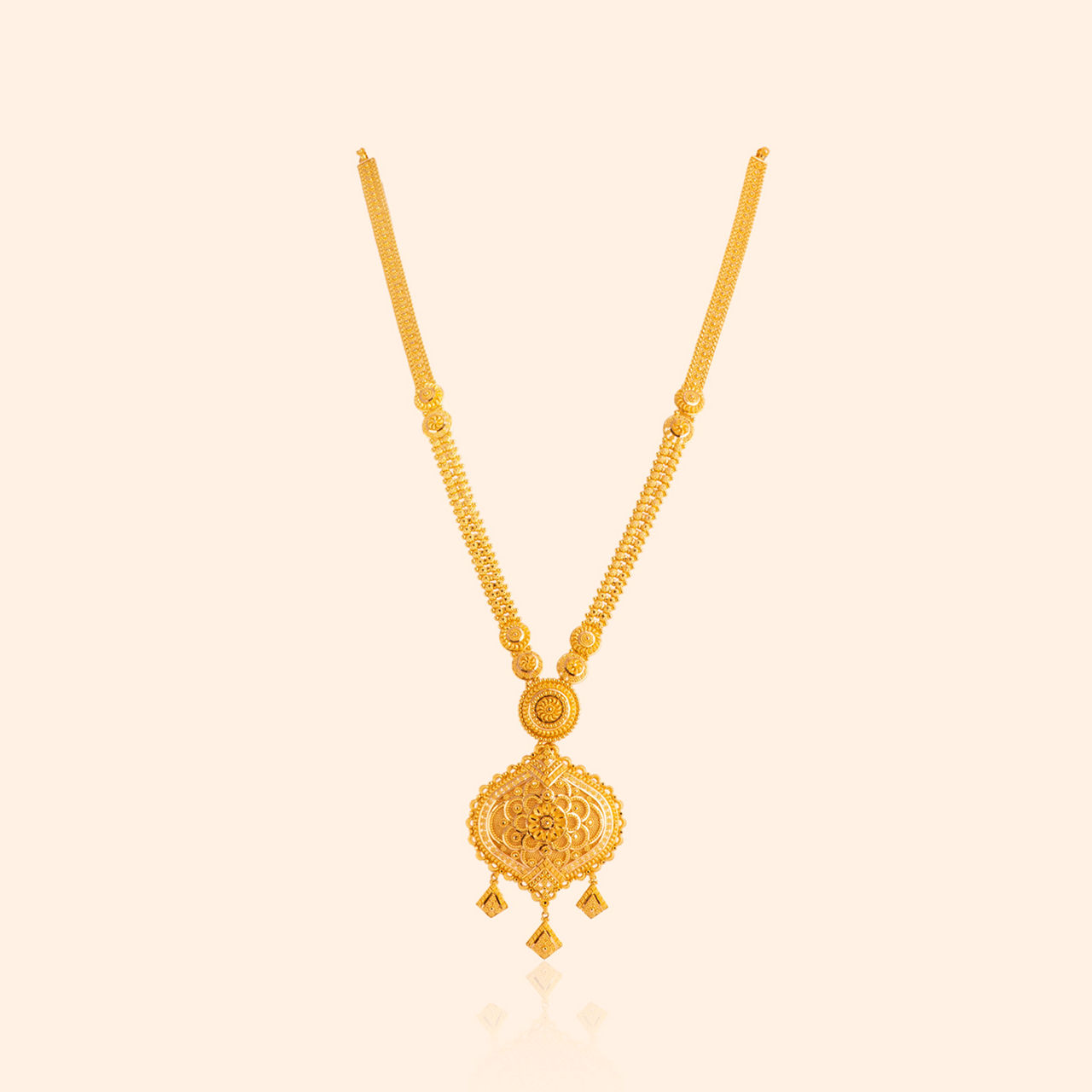 Evoking heritage grandeur whispered through threads of gold, these earrings sway with intricate artistry, celebrating timeless traditions through each detail. They are a masterpiece of traditional craftsmanship, featuring round, ornate studs that suspend larger, beautifully worked drop elements showcasing exquisite filigree or jaali patterns, with delicate granulation accents creating rich texture. Below these, small, diamond-shaped charms dangle gracefully, adding gentle movement and completing the opulent look. Perfect for festive occasions, these magnificent earrings are fashioned from radiant 22 karat yellow gold.