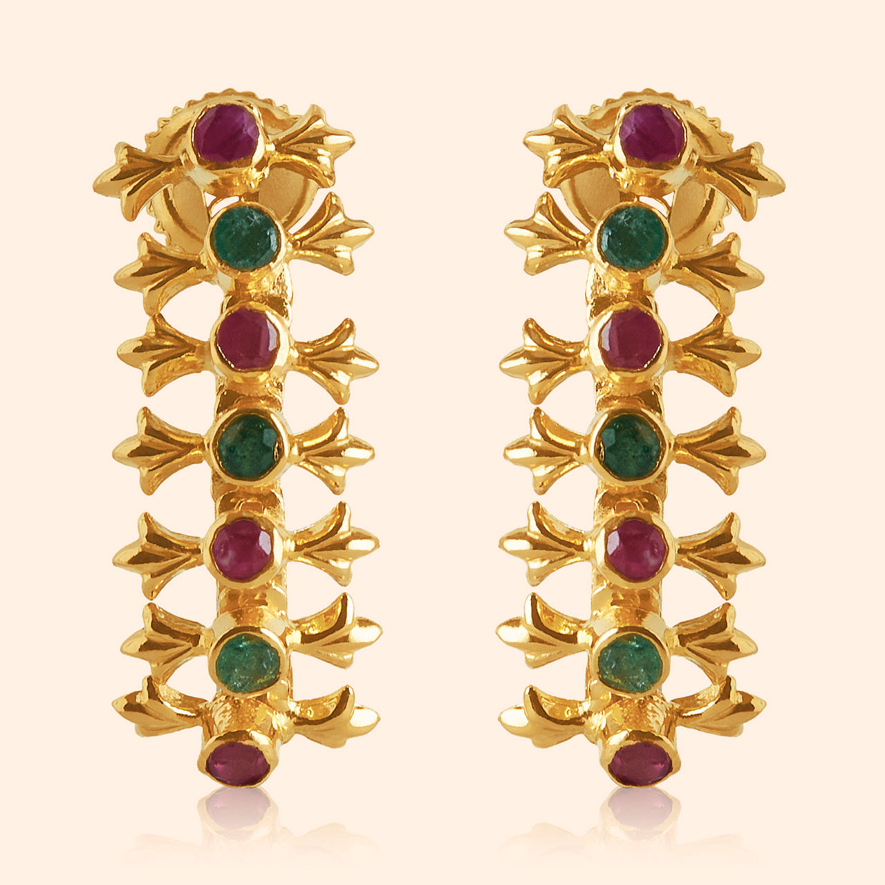 Jewelled buds align in vibrant row, where emerald and ruby softly glow, making festive spirits grow. This traditional short necklace showcases a rhythmic pattern of pointed golden buds, each accented with alternating green and red stones, creating a colourful and textured effect along its length. It offers a classic design rich with symbolism and visual appeal. Expertly crafted in bright 22 karat yellow gold, it provides a striking yet elegant adornment, perfectly suited for traditional ceremonies and weddings.