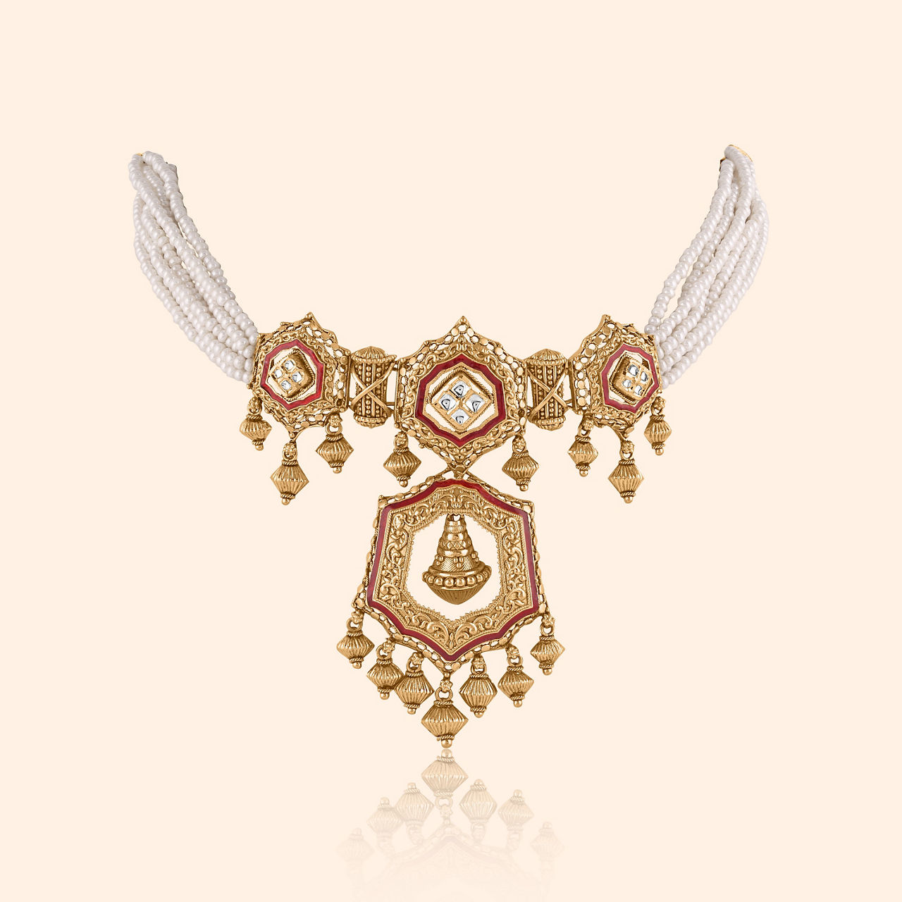 Where ancient whispers meet a vibrant hue,These ornate drops, a grand tradition's view. Crafted in radiant 22KT yellow gold, these stunning drop earrings embody an elevated traditional design, brought to life with a rich antique finish. A harmonious blend of intricate floral filigree and balanced geometric patterns forms their striking silhouette, further enhanced by a vibrant deep red enamel and luminous central gemstones that capture the light. Designed for heavy occasion wear, these earrings will complete your grand ensemble, whether a rich heavy silk saree or an intricately embroidered lehenga, serving as a regal statement that captures the essence of celebration and heritage.