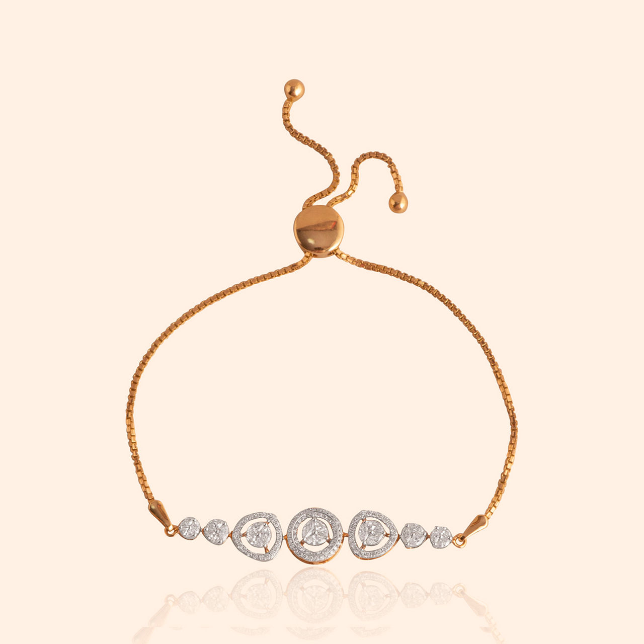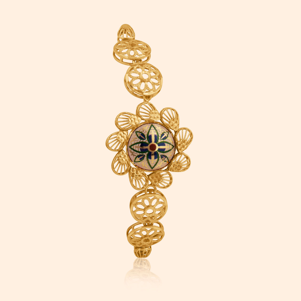 Lotus blooms in colours rich and deep, secrets of beauty that the heart will keep, promising joy while others sleep. This gold bracelet is a vibrant celebration of artistry, featuring a central floral motif meticulously detailed with colourful enamel, reminiscent of the sacred lotus. Flanking this centrepiece are textured gold discs interspersed with sparkling coloured stones, adding a touch of festive brilliance. This adjustable bracelet combines traditional symbolism with contemporary flair, making it an eye-catching accessory. It is beautifully crafted in radiant 22 karat yellow gold, perfect for adding a splash of colour and symbolic meaning.