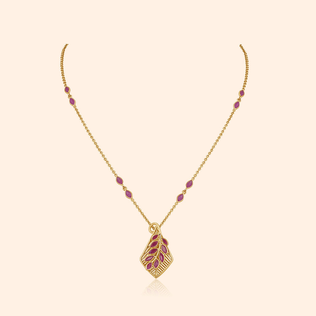 Crimson gems in leafy frames unfold their lore, earrings whispering tales from nature's gentle door, capturing the essence of vibrant forest floor, forevermore. These leaf gold earrings showcase intricate, leaf-shaped openwork frames cradling marquise-cut ruby-like stones. The design blends organic forms with geometric precision, offering a touch of ethno-contemporary flair. Ideal for adding a pop of colour and refined artistry to your look, they are expertly fashioned from lustrous 18 karat yellow gold.