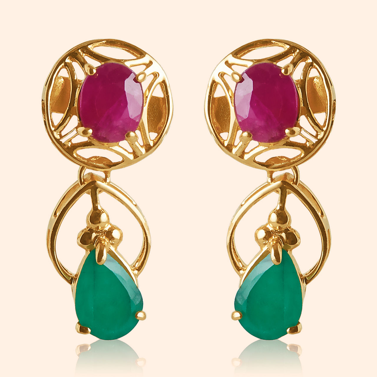 Ruby blossoms glow on a golden vine so neat, where emerald dewdrops dangle bittersweet, making beauty quite complete. This gold necklace features a delightful dance of colour and form, with a series of vibrant ruby-like gems set along a graceful chain. Beneath each ruby station, a delicate openwork loop suspends a pear-shaped emerald-green drop, adding elegant movement and captivating contrast. The design evokes the feeling of a blossoming garden. Crafted beautifully in gleaming 22 karat yellow gold, it is perfect for festive or special occasions.