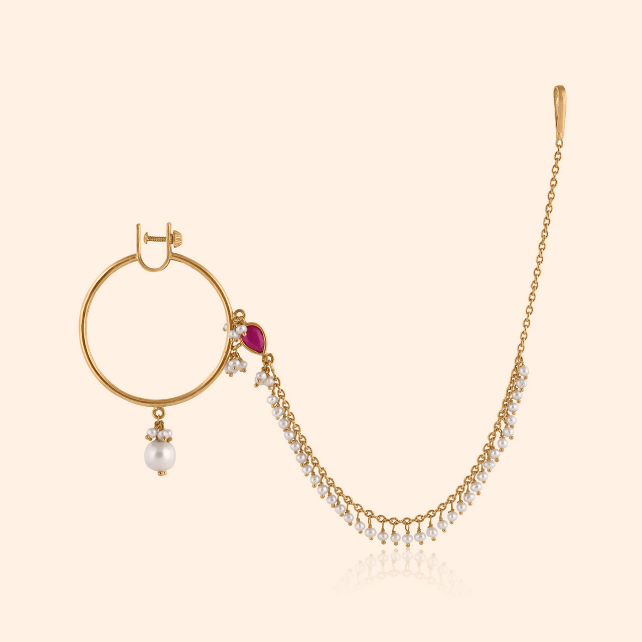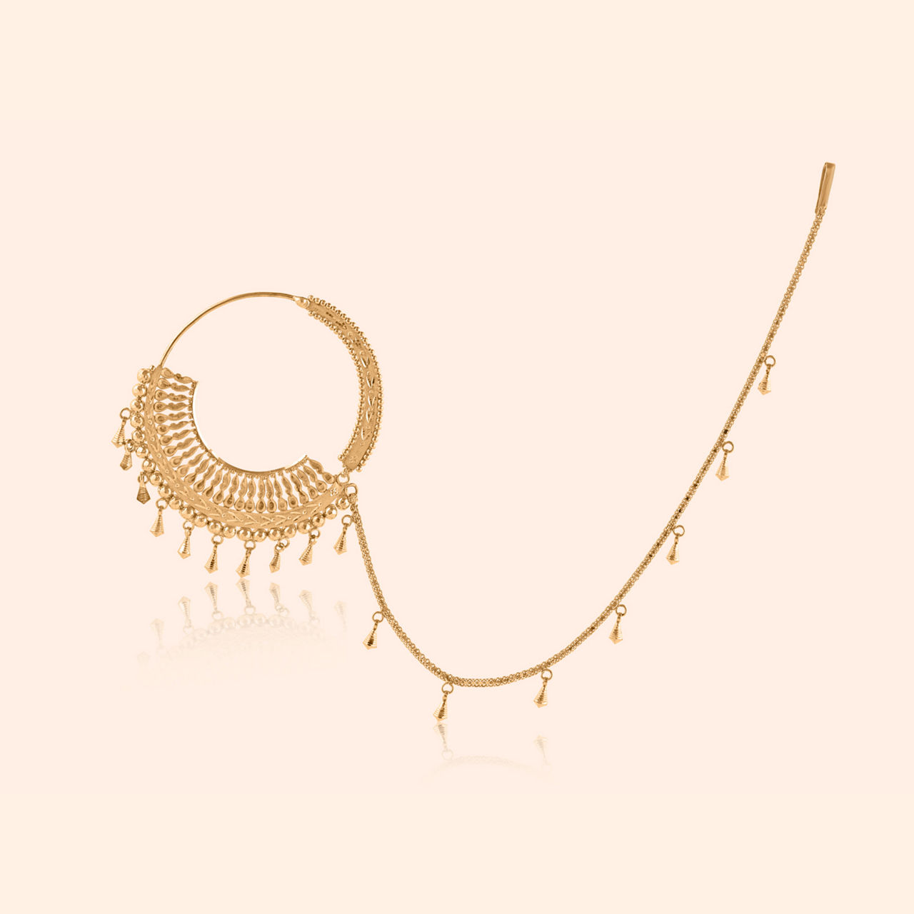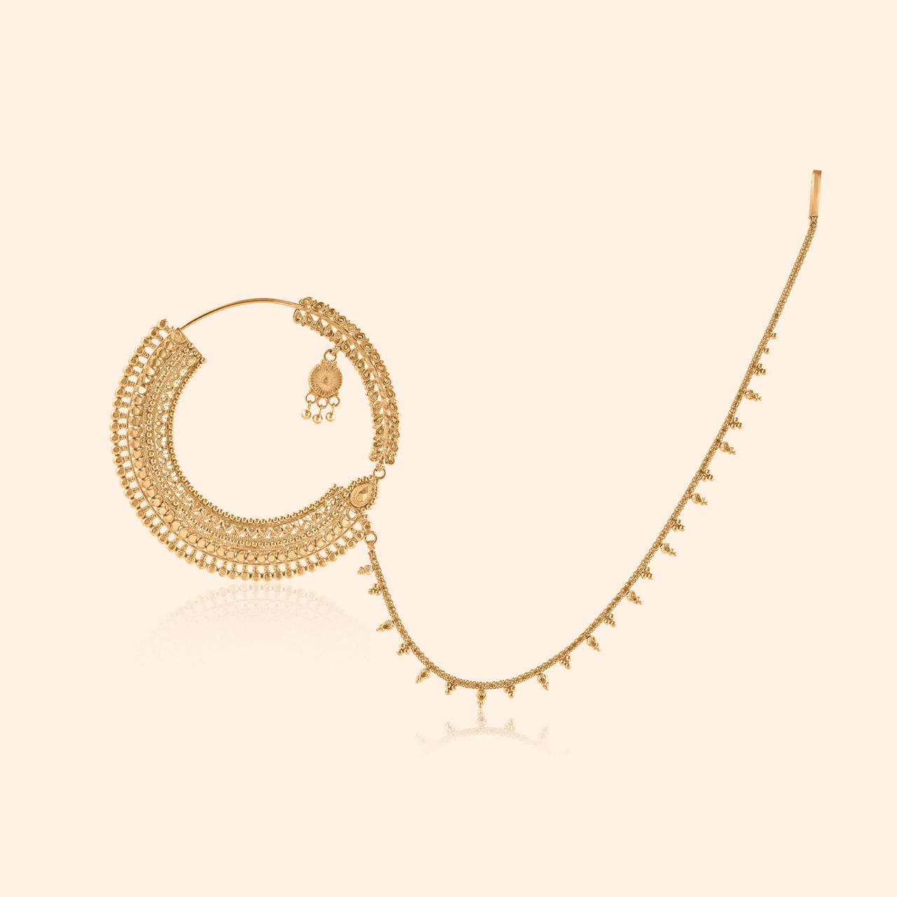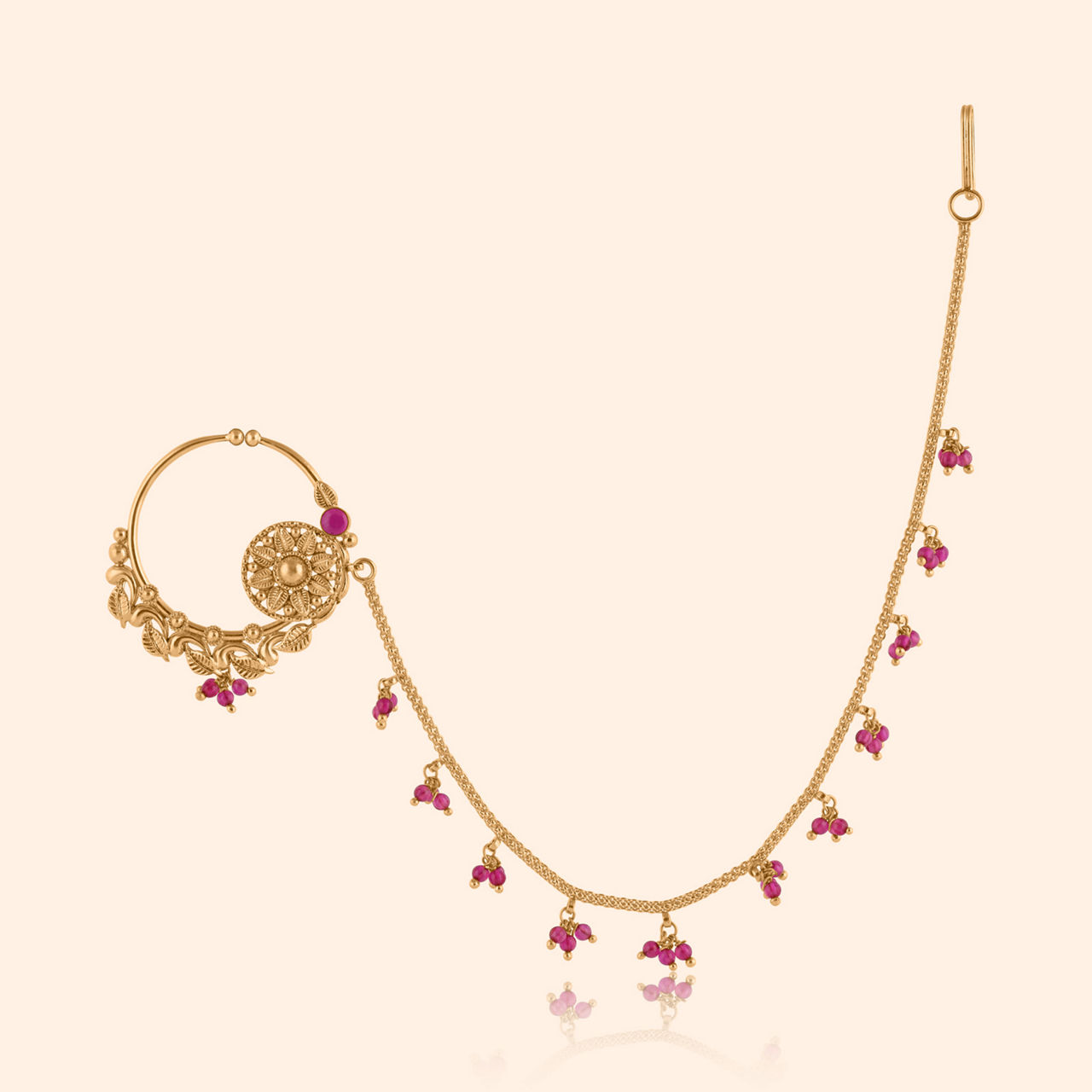 A symbol of timeless beauty, this 22 karat yellow gold nath features a stunning lotus motif, delicately adorned with vibrant gemstones, kundan, and luminous pearls. Crafted for heavy occasion wear, its elevated traditional and antique finish design makes it the perfect statement piece for celebratory moments. Embrace the elegance of this intricate nath, designed to add a regal touch to your ensemble, celebrating both tradition and sophistication.