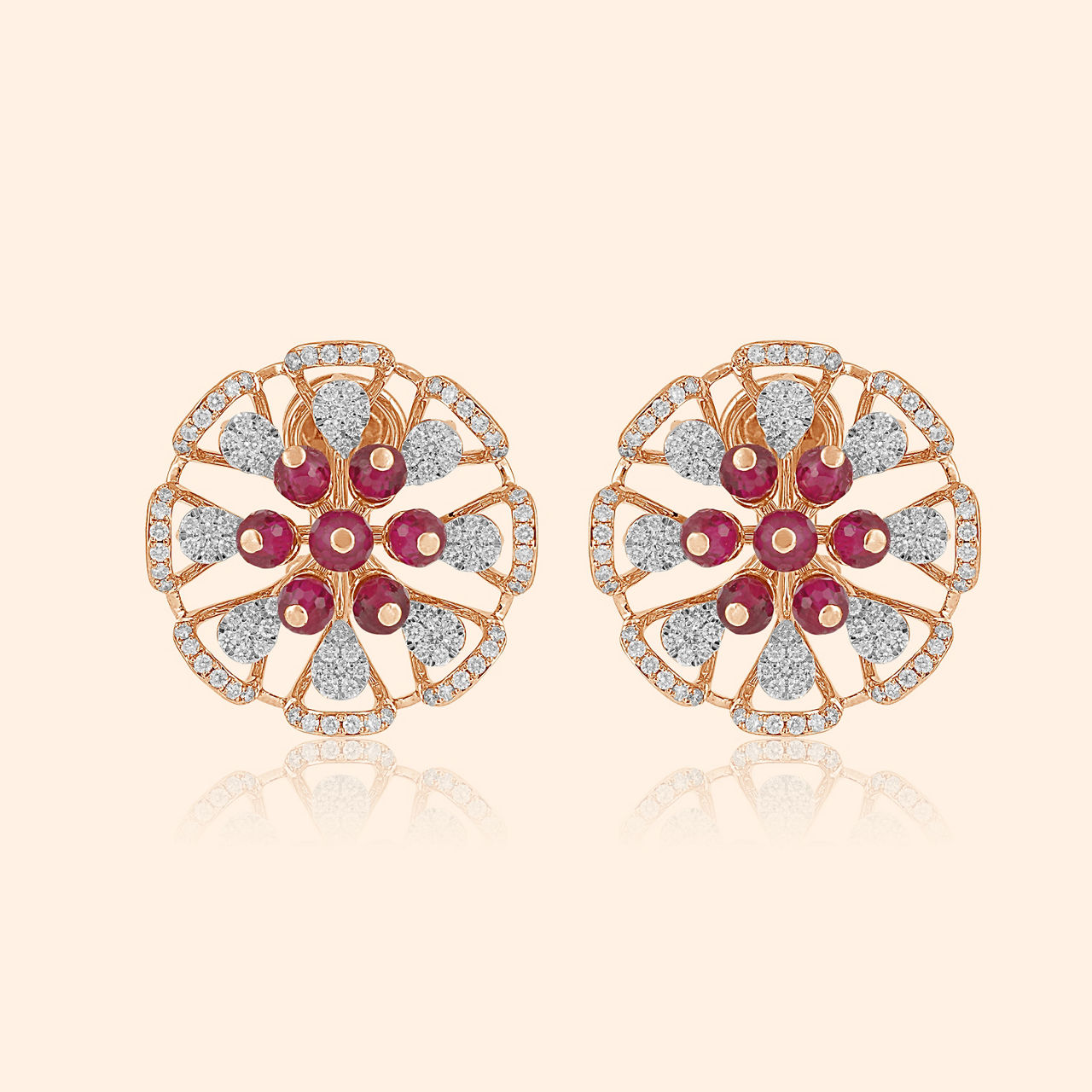 Crimson petals meet diamond dew, in rosy gold forever new, flower of passion shining through. This exquisite necklace features a stunning floral medallion pendant, intricately set with vibrant red stones forming the bloom’s heart, surrounded by petals crafted from sparkling diamonds and openwork details. It is a captivating blend of colour and brilliance. Elegantly fashioned in warm 18 karat pink gold, it rests on a delicate chain, offering a sophisticated statement piece perfect for evening galas and romantic occasions.