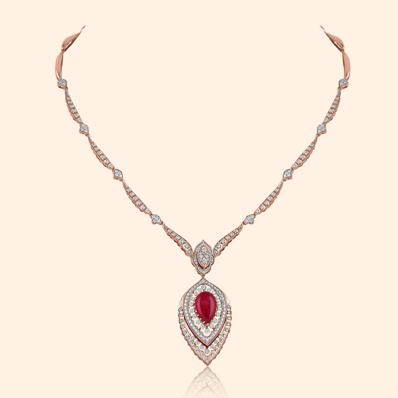 A feathered dream, aflame in rose gold's embrace, where vibrant hues and diamonds intertwine with grace. These exquisite 14KT rose gold stud earrings gleam with a high polish, embodying a modern design that draws inspiration from the majestic peacock feather motif. A vibrant pink gemstone forms the captivating heart of each earring, framed by a delicate lattice of brilliant diamonds that sparkle with every turn. Perfect for heavy occasion wear, these earrings will elevate your lehenga or heavy silk saree, making you the epitome of elegance at any grand celebration.
