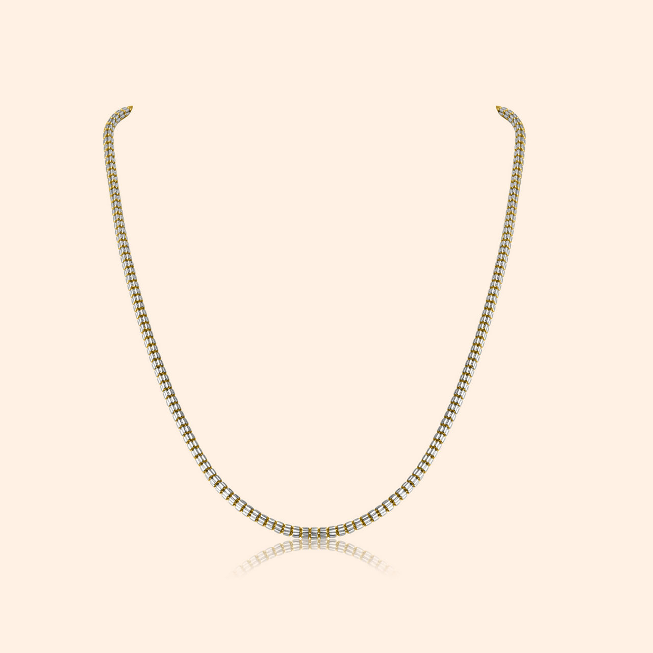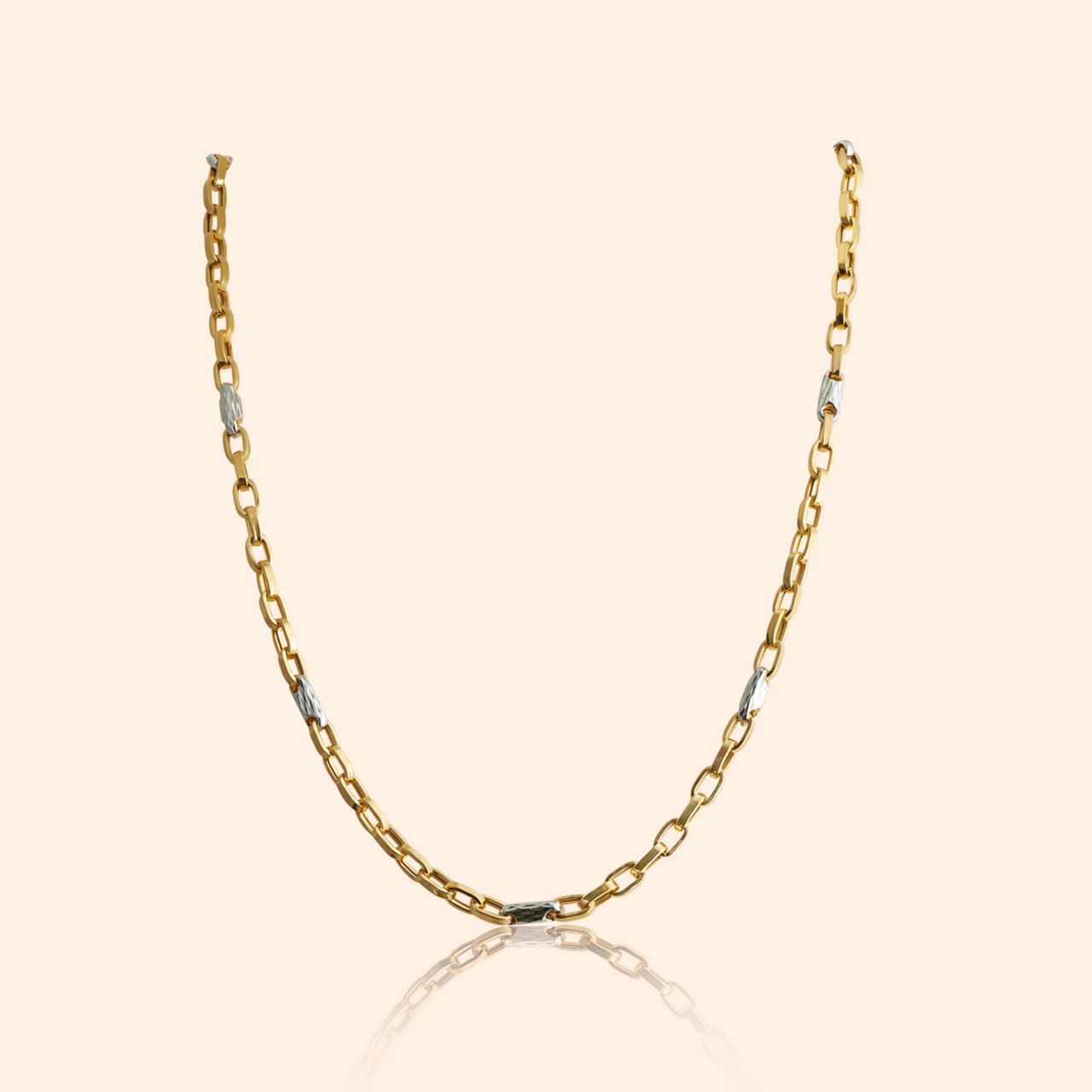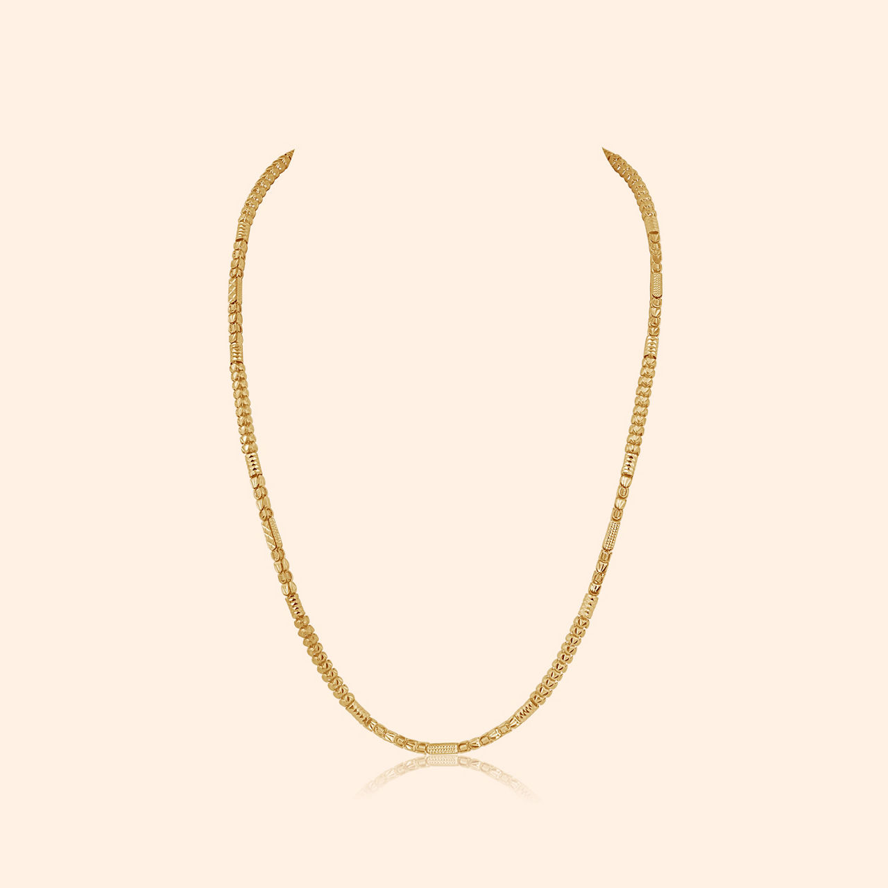 Structured elegance flows in a golden line, where linked strength and subtle textures combine, a truly unisex fine design. This chain presents a modern classic aesthetic with its distinctive segmented construction, appealing to a broad range of tastes. Composed of cylindrical or barrel-shaped links, each meticulously textured to catch the light and connected by smaller, smoother links, it offers a unique visual rhythm. Its versatile style makes it suitable for anyone seeking a sophisticated yet understated piece that works well alone or layered. Superbly crafted in gleaming 22 karat yellow gold, its quality and unisex design ensure lasting appeal.