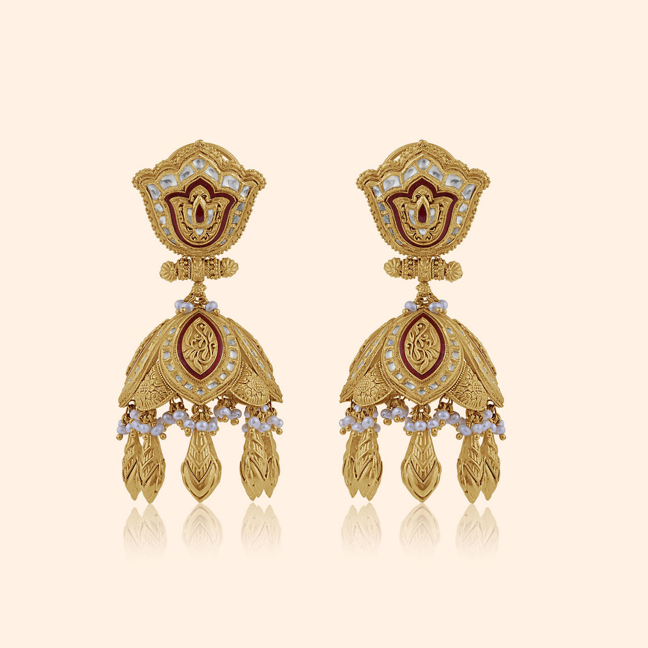 Drawing from the sanctity of timeless vows, the Saptapadma Gold Choker Necklace honors the bride’s sacred journey. Inspired by the seven promises of Saptapadi, its layered lotus petals, each etched with a commitment—symbolize respect, companionship, and shared responsibility. Crafted in 22KT yellow gold with hints of auspicious red, it reflects purity and new beginnings. Resting gracefully against the neckline, it becomes more than adornment, a shimmering heirloom of devotion and a wearable promise of love. Thoughtful karigari shapes every detail, celebrating tradition, artistry, and the beauty of lifelong companionship.