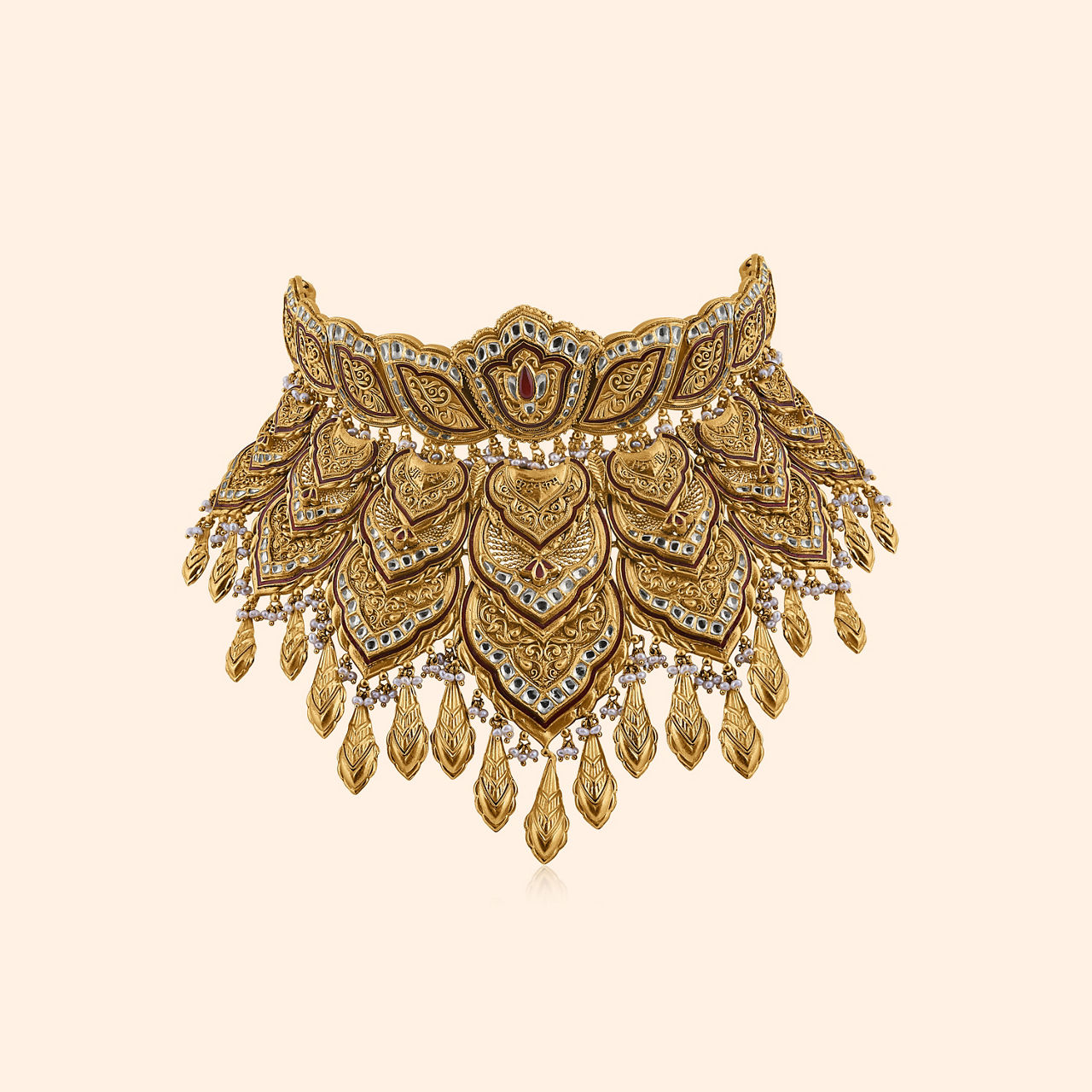 Drawing from the sanctity of heritage vows, the Saptapadma Gold Drop Earrings are crafted as a tribute to the bride’s sacred journey. Inspired by the seven promises of Saptapadi, their lotus-layered contours symbolize purity, devotion, and companionship. Made in 22KT yellow gold with hints of auspicious red, they offer a silhouette that feels both timeless and modern. Designed for graceful versatility, they transform from a classic stud to an elegant drop—perfect for rituals and celebrations. Every detail reflects thoughtful karigari and emotional intention, creating a piece that honors tradition and the beauty of lifelong promises.