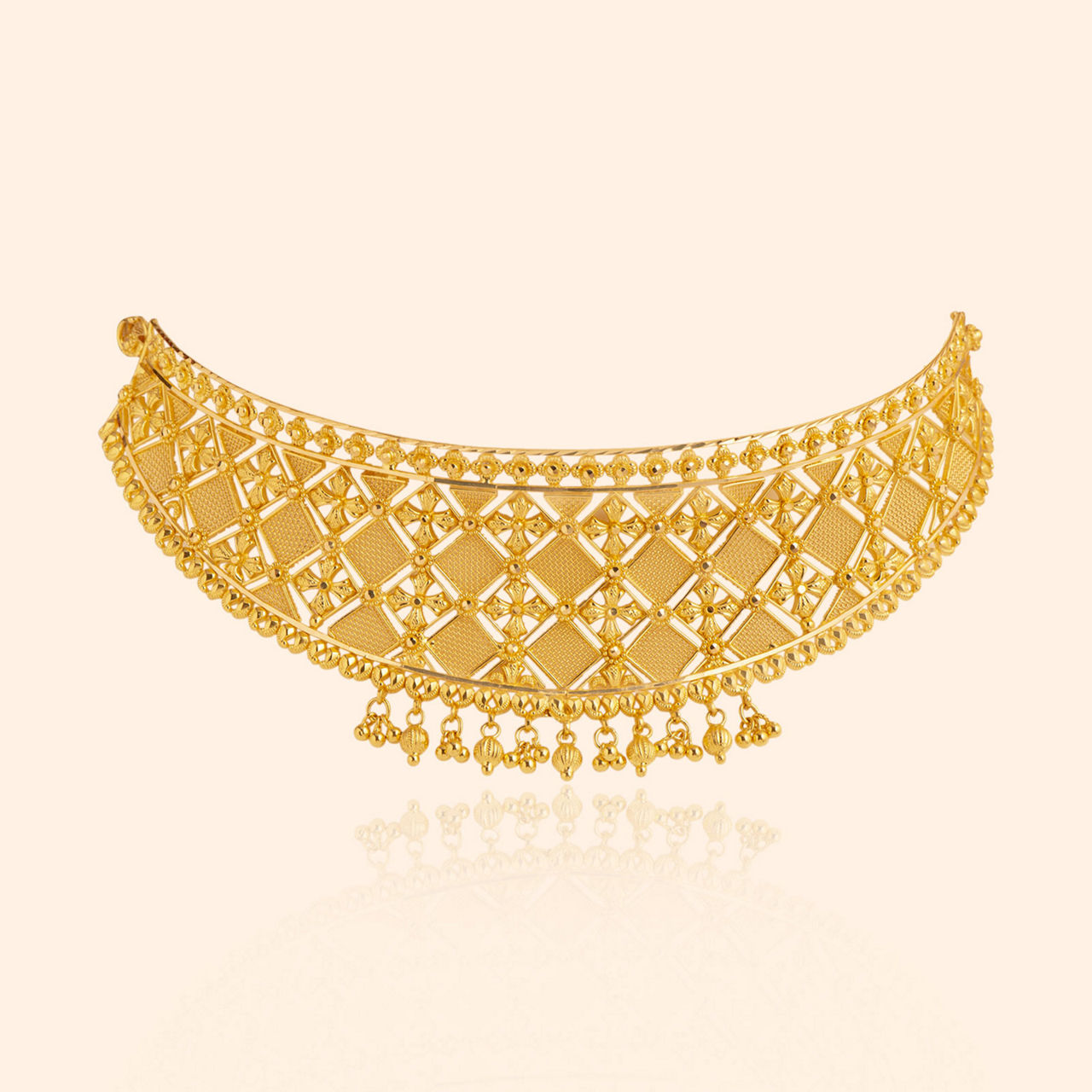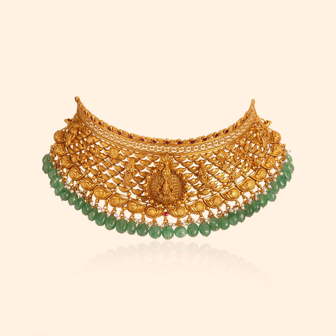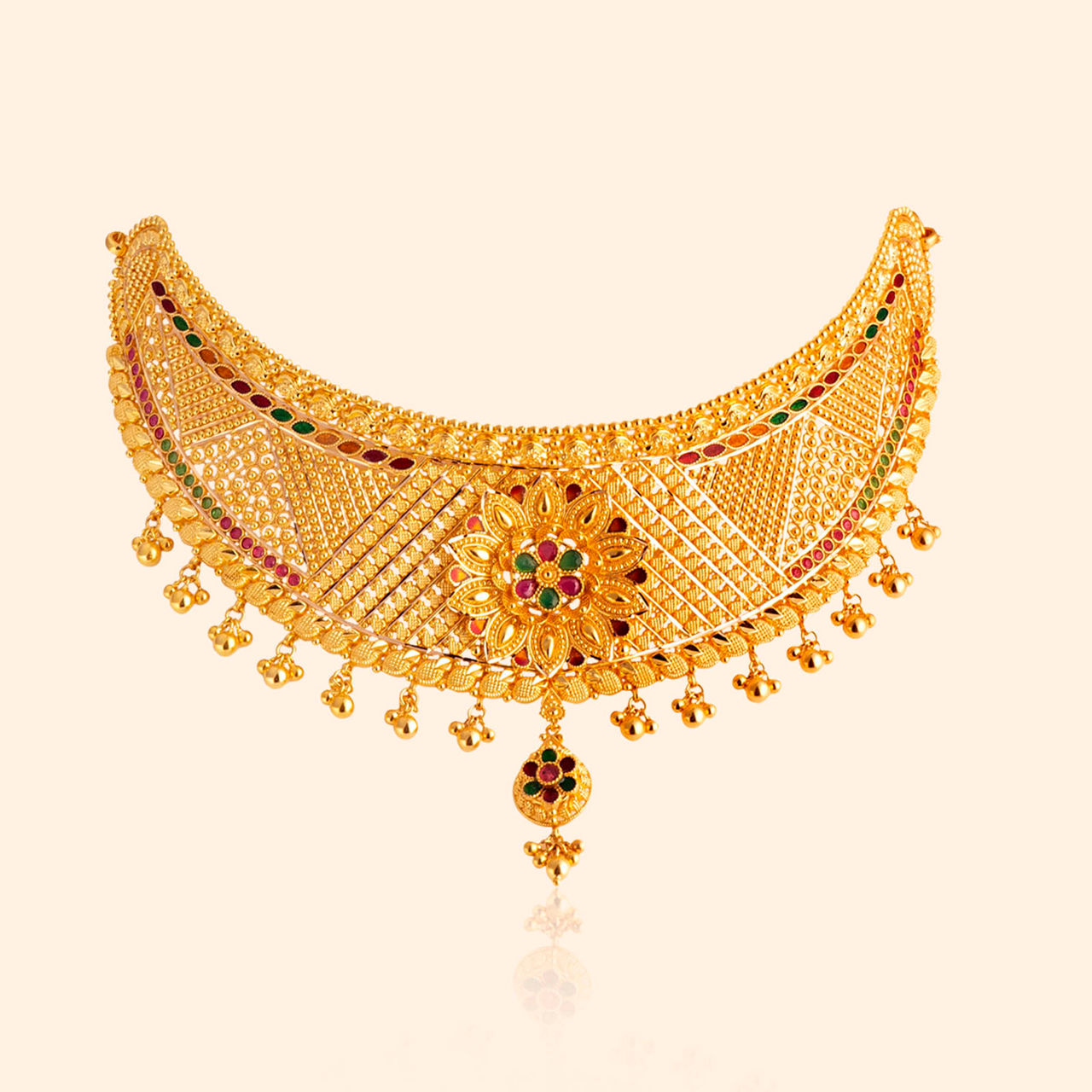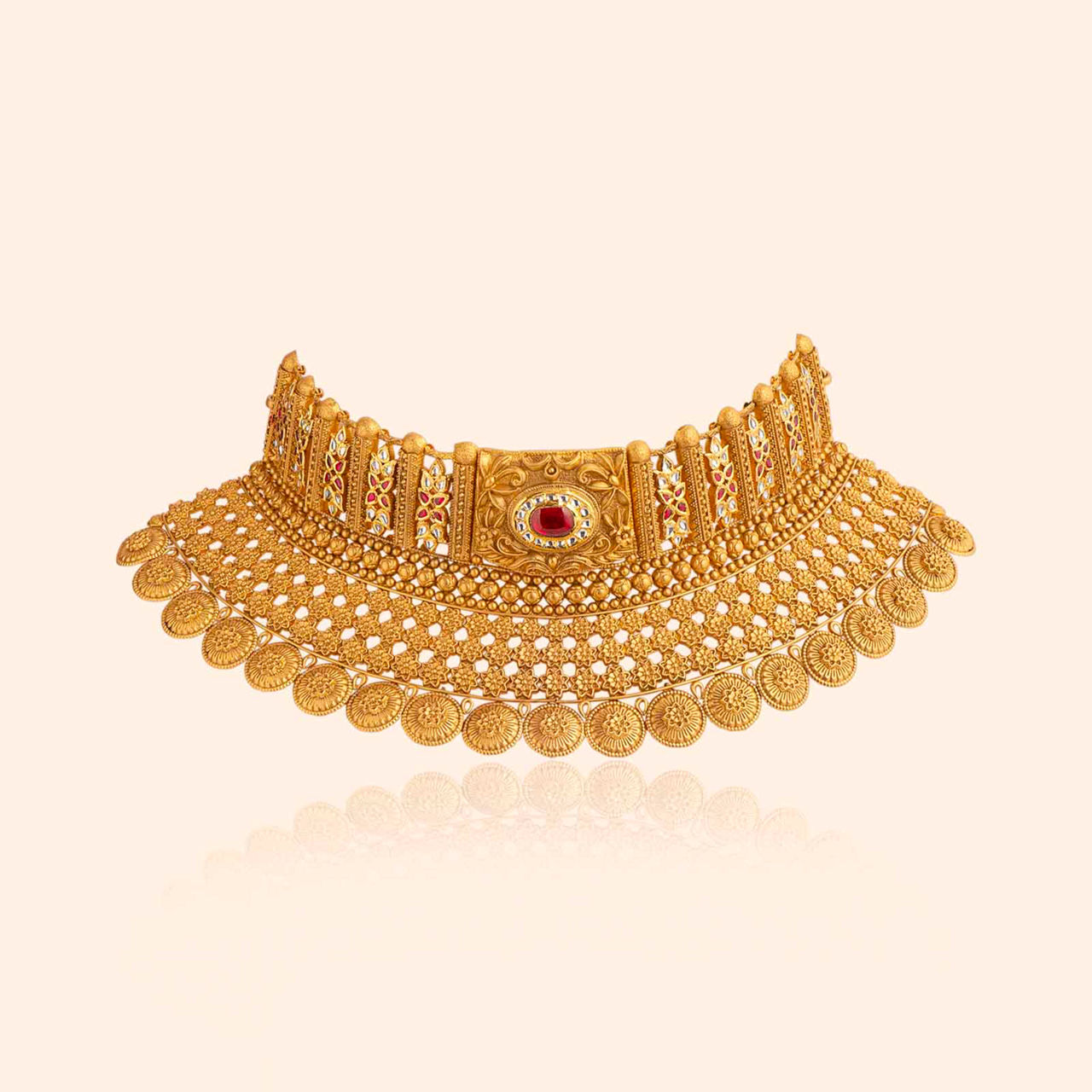 Designed to enhance the bride’s beauty on her special day, this 22 karat yellow gold choker necklace is a perfect fusion of traditional charm and modern elegance. Crafted by hand, the jewel features a captivating combination of floral and geometric motifs, adorned with vibrant glass Kundan, pink stones, and lustrous pearls. The multicolour detailing adds a pop of brilliance, while the standard antique finish gives it a timeless appeal. Ideal for bridal wear, this choker exudes an elevated traditional style, making it a statement jewel that complements the bride’s radiant spirit.