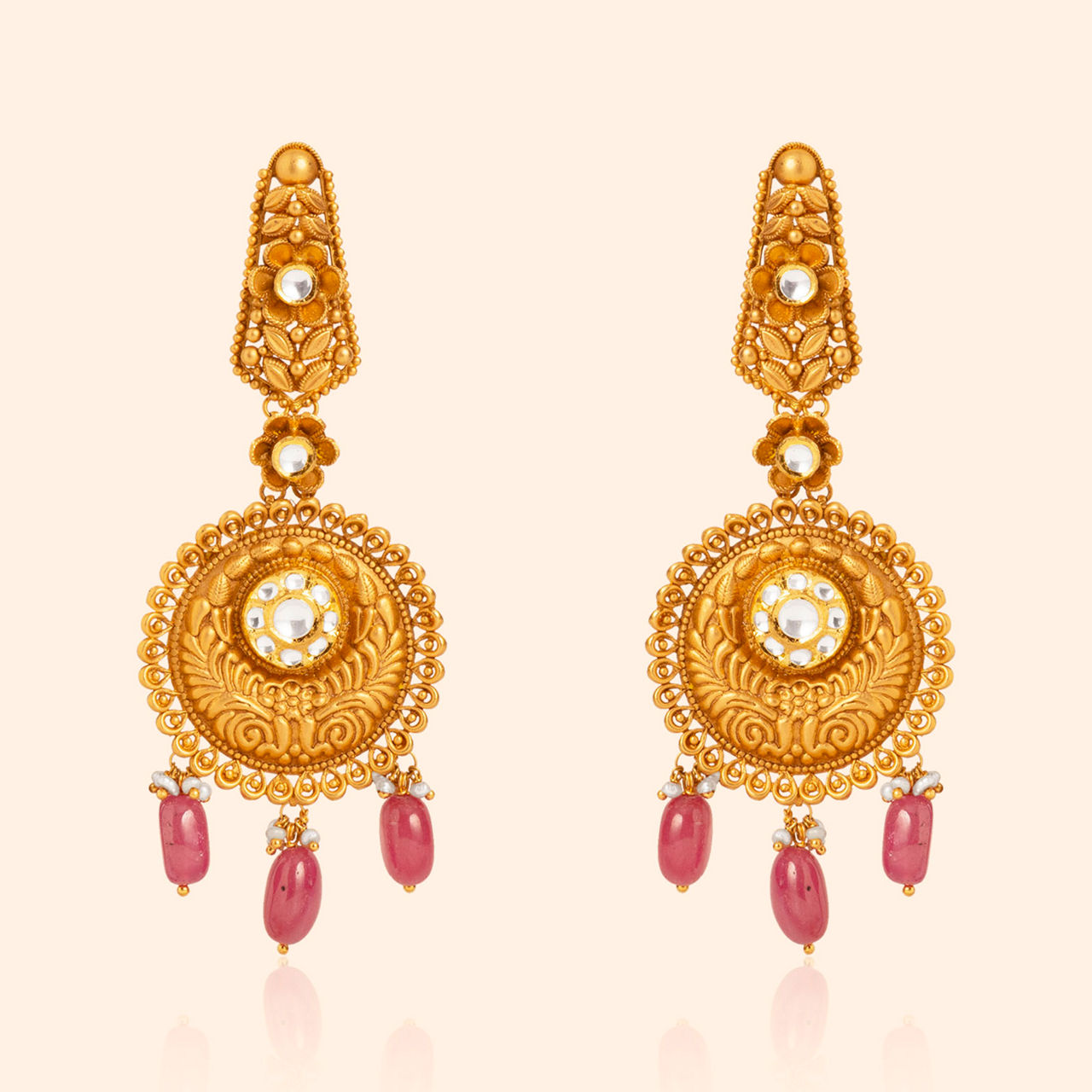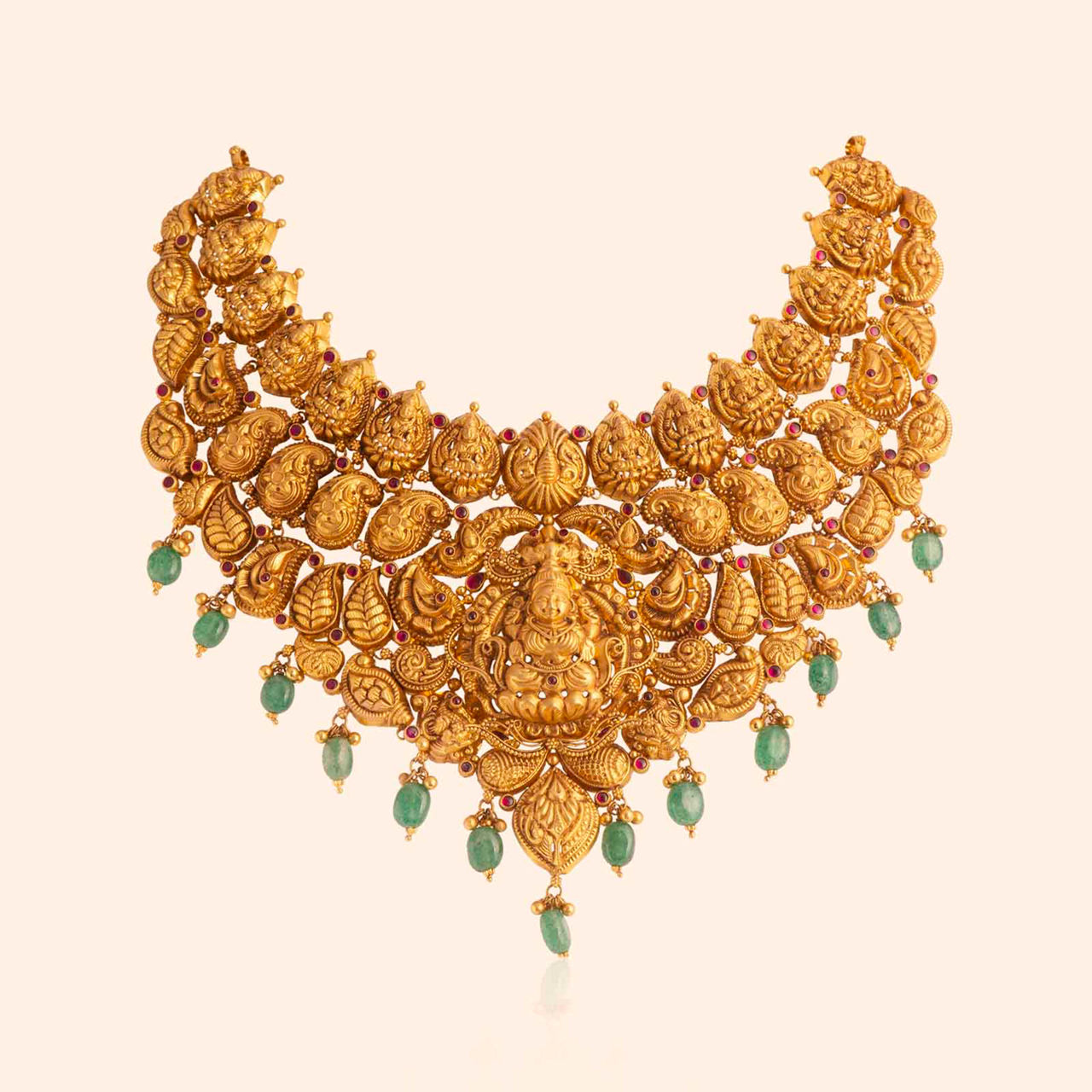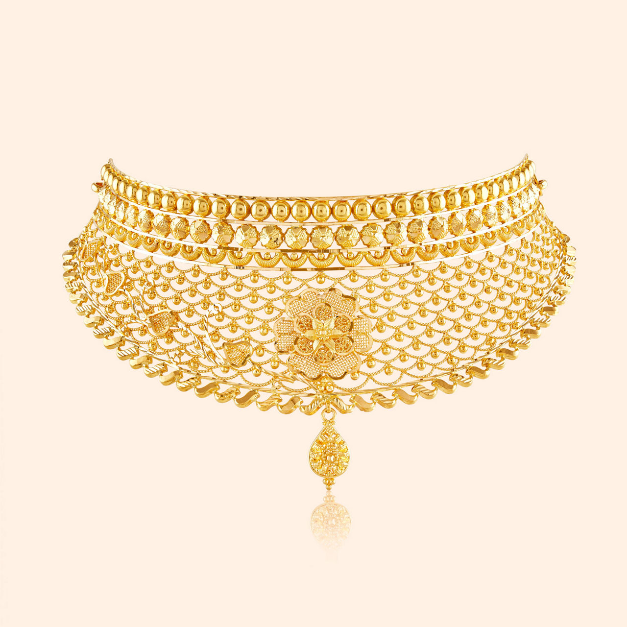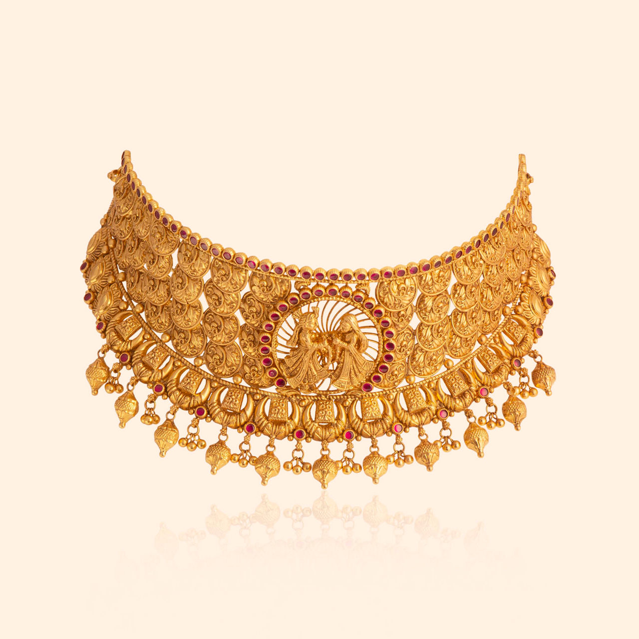 Designed to enhance the bride’s beauty on her special day, this 22 karat yellow gold choker necklace is a perfect fusion of traditional charm and modern elegance. Crafted by hand, the jewel features a captivating combination of floral and geometric motifs, adorned with vibrant glass Kundan, pink stones, and lustrous pearls. The multicolour detailing adds a pop of brilliance, while the standard antique finish gives it a timeless appeal. Ideal for bridal wear, this choker exudes an elevated traditional style, making it a statement jewel that complements the bride’s radiant spirit.
