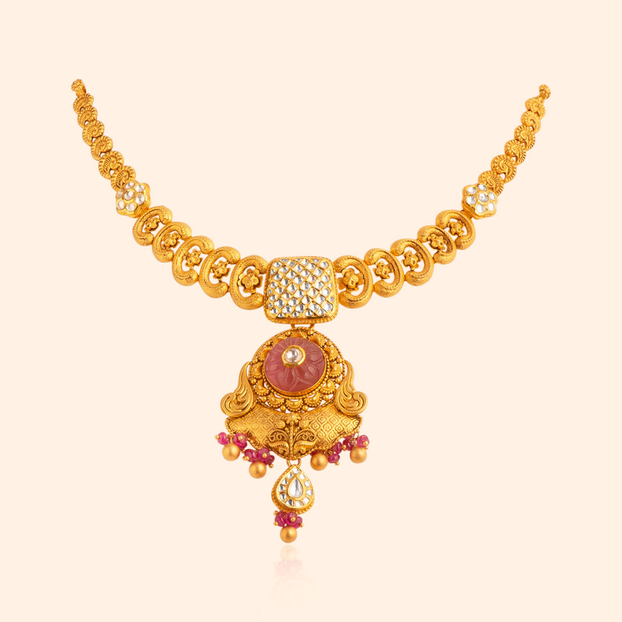 A rosy centre gleams within an ornate golden frame, these earrings bloom with colour bright, whispering tales of love’s sweet, gentle name. These gold earrings feature a captivating design centered around a pink-hued stone set within an intricately detailed circular element, reminiscent of traditional motifs. Uncut diamonds or polki add subtle sparkle, while dangling elements combining pearls and coloured beads enhance the festive appeal, offering a vibrant and romantic statement. These beautiful earrings are crafted in rich 22 karat yellow gold.