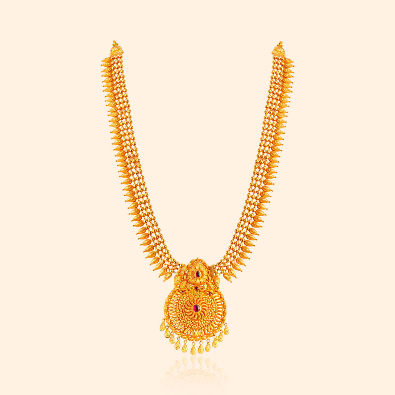An ode to heritage, these 22KT gold drop earrings blend floral elegance with timeless artistry. Designed for the discerning bride, their sculpted silhouettes radiate a regal charm, accentuated by delicate glass polki and the deep crimson allure of stones. Every curve, every flourish speaks of traditions carried forward, making them an exquisite choice for the grandest of wedding moments. Whether paired with a silk saree or an opulent lehenga, these earrings frame your radiance in a golden embrace.