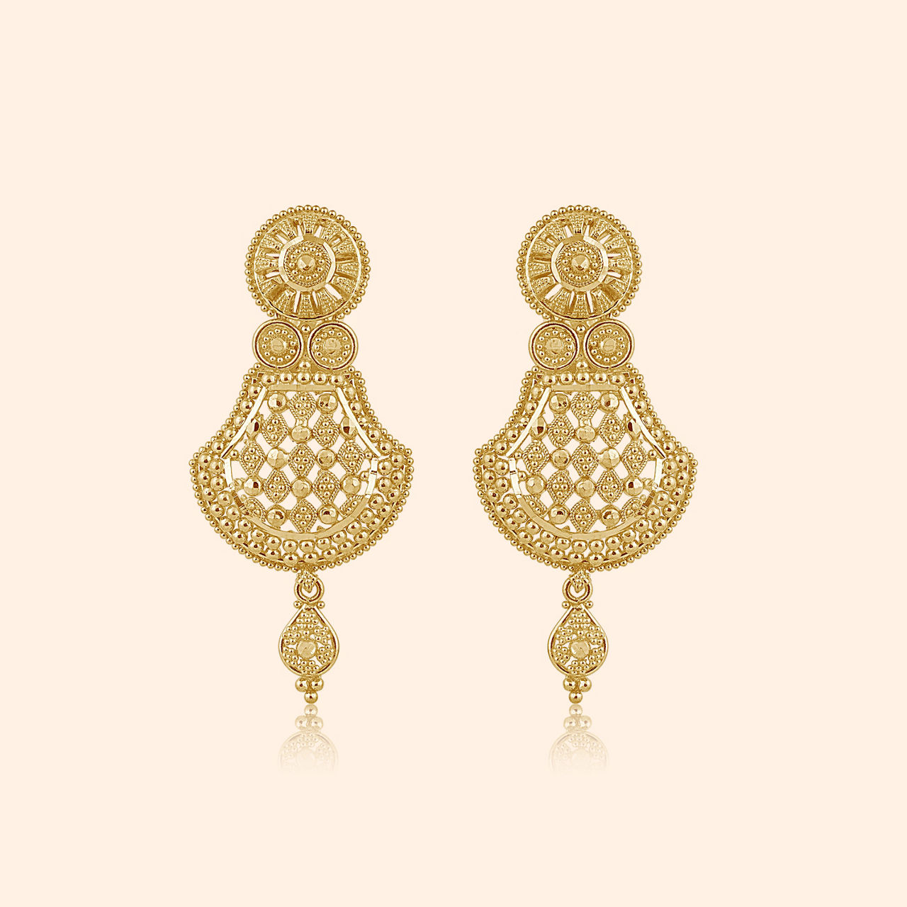 Grace flows like a quiet hymn through this 22KT yellow gold long necklace, crafted in a floral-inspired silhouette that echoes the richness of tradition. Each element is infused with fluid curves and intricate detailing, evoking the elegance of heritage wear with a refreshed sense of simplicity. The warm yellow finish gives it an inviting glow, while its elongated form carries a majestic presence;perfect for occasions where quiet grandeur leaves the most lasting impression.