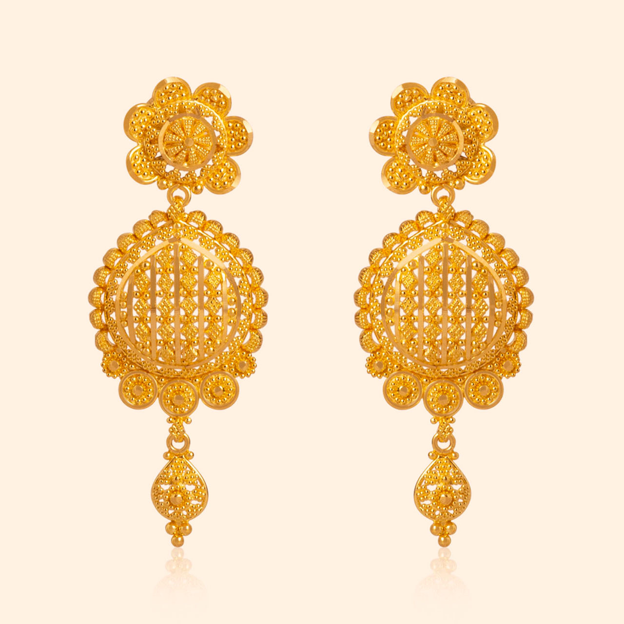 Sun-like radiance hangs, majestic gold so grand, intricate patterns speak of craft from a skilled hand. This magnificent long necklace, or haar, embodies traditional grandeur with its impressive scale and detailed workmanship. The chain comprises ornate, textured links leading to a large, elaborate circular pendant. The pendant features intricate layers of filigree, granulation, and traditional motifs, culminating in a delicate drop element. The necklace is a stunning celebration of heritage, crafted in resplendent 22 karat yellow gold.