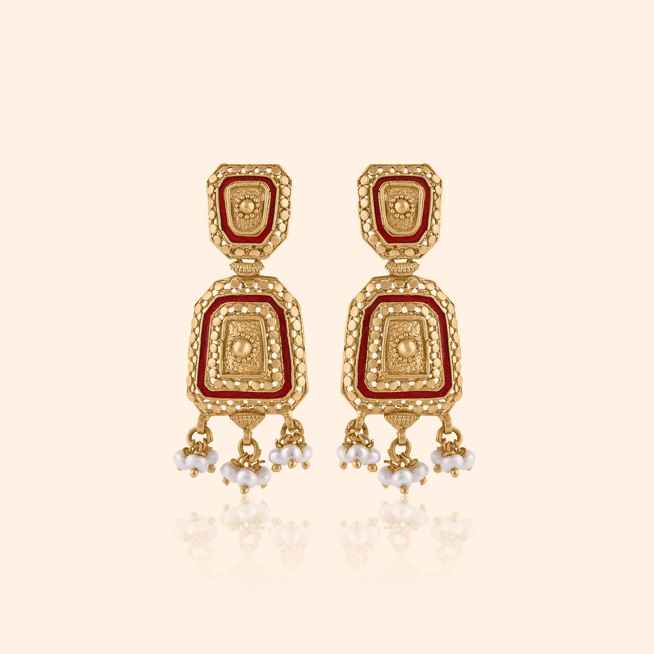 In ancient gold, a sun-kissed vow unfolds, Each framed moment, a story of love it holds. This 22KT yellow gold necklace, sculpted with an antique finish, embodies an elevated traditional design. Its grand form showcases harmonious square motifs, each illuminated by a central sun-like emblem and vibrant red enamel, with delicate pearl clusters gracefully adorning the base. A true crowning jewel for bridal wear, this piece is destined to beautifully complement a heavy silk saree or an ornate lehenga, marking your auspicious day with unparalleled splendor.