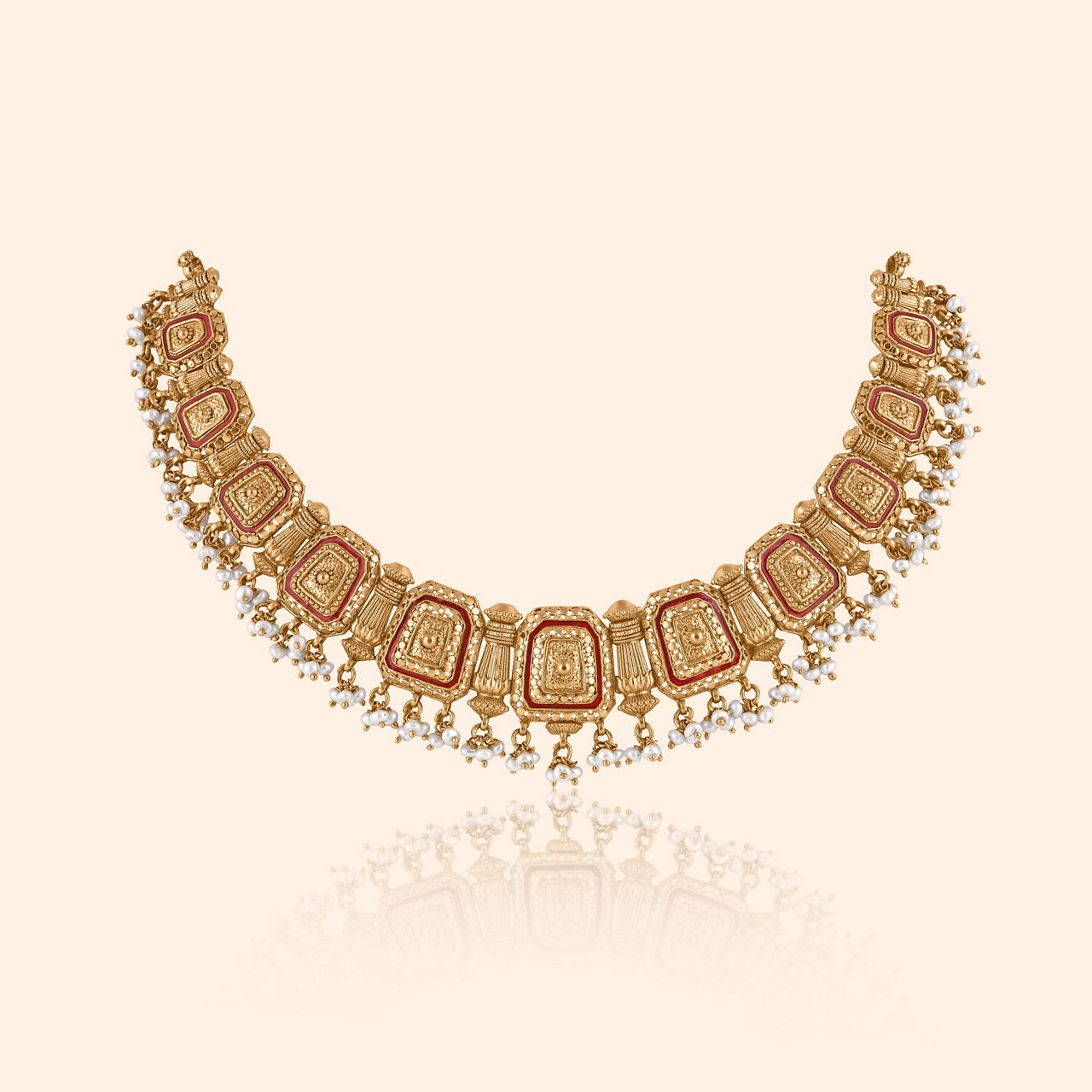 May the ancient sun bless your new path, a radiant echo of love's warm hearth. Crafted from luminous 22KT yellow gold with an exquisite antique finish, these bridal drop earrings embody an elevated traditional design. A central sun motif is artfully framed by harmonious patterns and vibrant red enamel, culminating in delicate pearl drops. These earrings are a quintessential adornment for your grand bridal ensemble, perfect with a heavy silk saree or an elaborate lehenga, symbolizing a new dawn of beauty and blessings.
