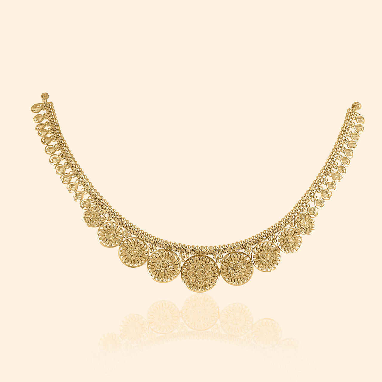 Solar flares burst forth with dangling charm delight, these earrings shine with festive cheer, making celebratory moments ever so bright. These gold earrings showcase a radiant sun-like stud, intricately detailed with granulation and embossed patterns. Below, multiple strands adorned with leaf motifs and dangling golden spheres create a lively cascade effect, embodying elevated traditional style perfect for heavy occasion wear and cultural festivities, full of movement and golden shimmer. These striking earrings are crafted in luminous 22 karat yellow gold.