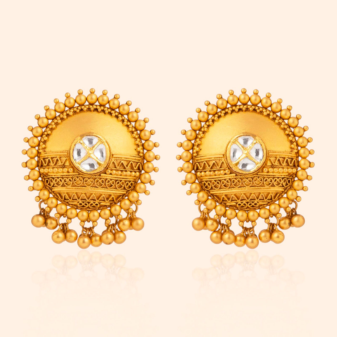 Sunburst pendants hold crystals bright, surrounded by details casting golden light, layered discs forming an impressive sight. This majestic piece features a large central pendant composed of layered, textured discs culminating in a clear stone at the center. The necklace consists of repeating square and circular elements, intricately detailed and studded, creating a rich tapestry effect. This short necklace is a statement of grandeur, perfect for weddings or significant celebrations, crafted from opulent 22 karat yellow gold.